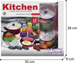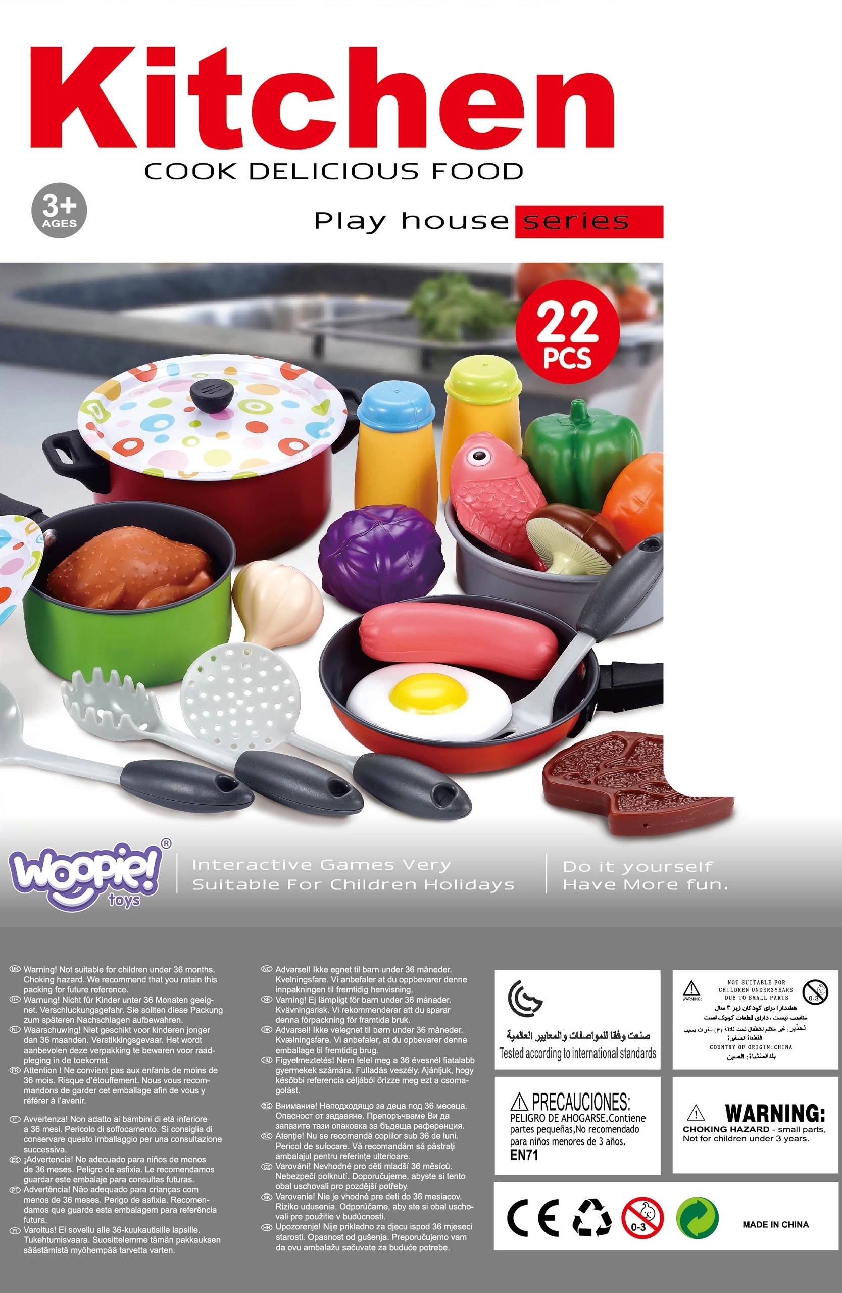 Su WOOPIE rinkiniu jūsų vaikas turės savo mažą virtuvėlę: puodus su dangteliais, keptuvę, dubenį, sietelį/samtį, prieskonius ir gausų maisto produktų pasirinkimą – nuo kiaušinio ir dešrelės iki žuvies, daržovių ar steiko. Dėl tikroviško atlikimo ir ryškių spalvų lavinama vaizduotė, smulkioji motorika ir socialiniai įgūdžiai žaidžiant „virtuvę“.