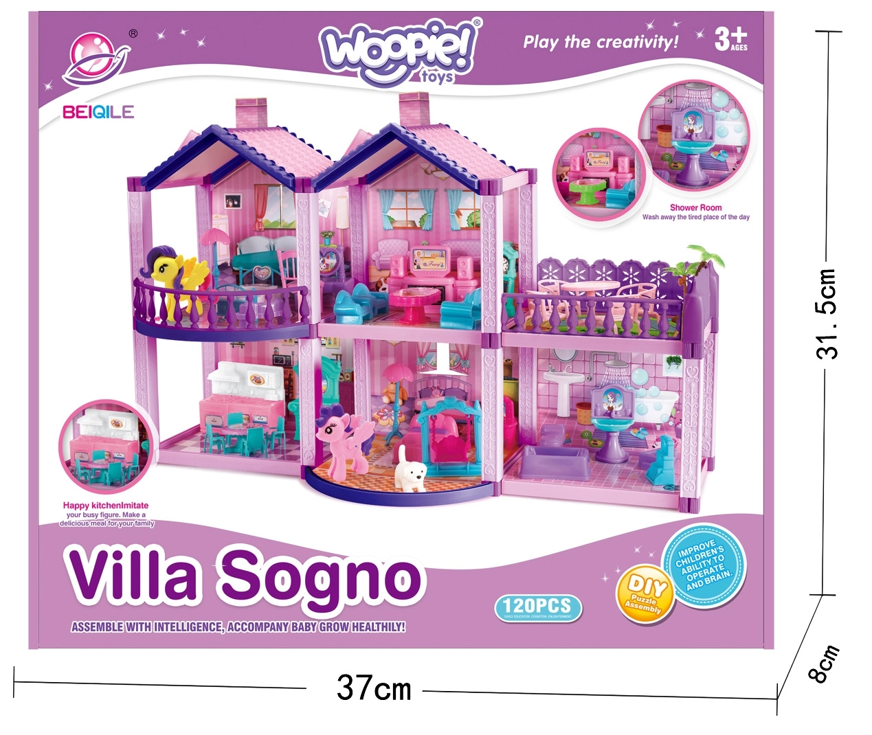 Magiskas plastikinis lėlių namelis iš prekės ženklo WOOPIE – tai dviejų aukštų vila su gausia komplektacija ir 120 dalių, skirta begaliniam kūrybiškam žaidimui. Rinkinyje rasite 2 ponius, šuniuką, baldus ir dekoracijas. Yra salonas, virtuvė su valgomuoju, dvi miegamosios, vonios kambarys ir balkonas. Aukšta kokybė, saugios medžiagos ir ryškios spalvos pradžiugins kiekvieną vaiką nuo 3 metų.