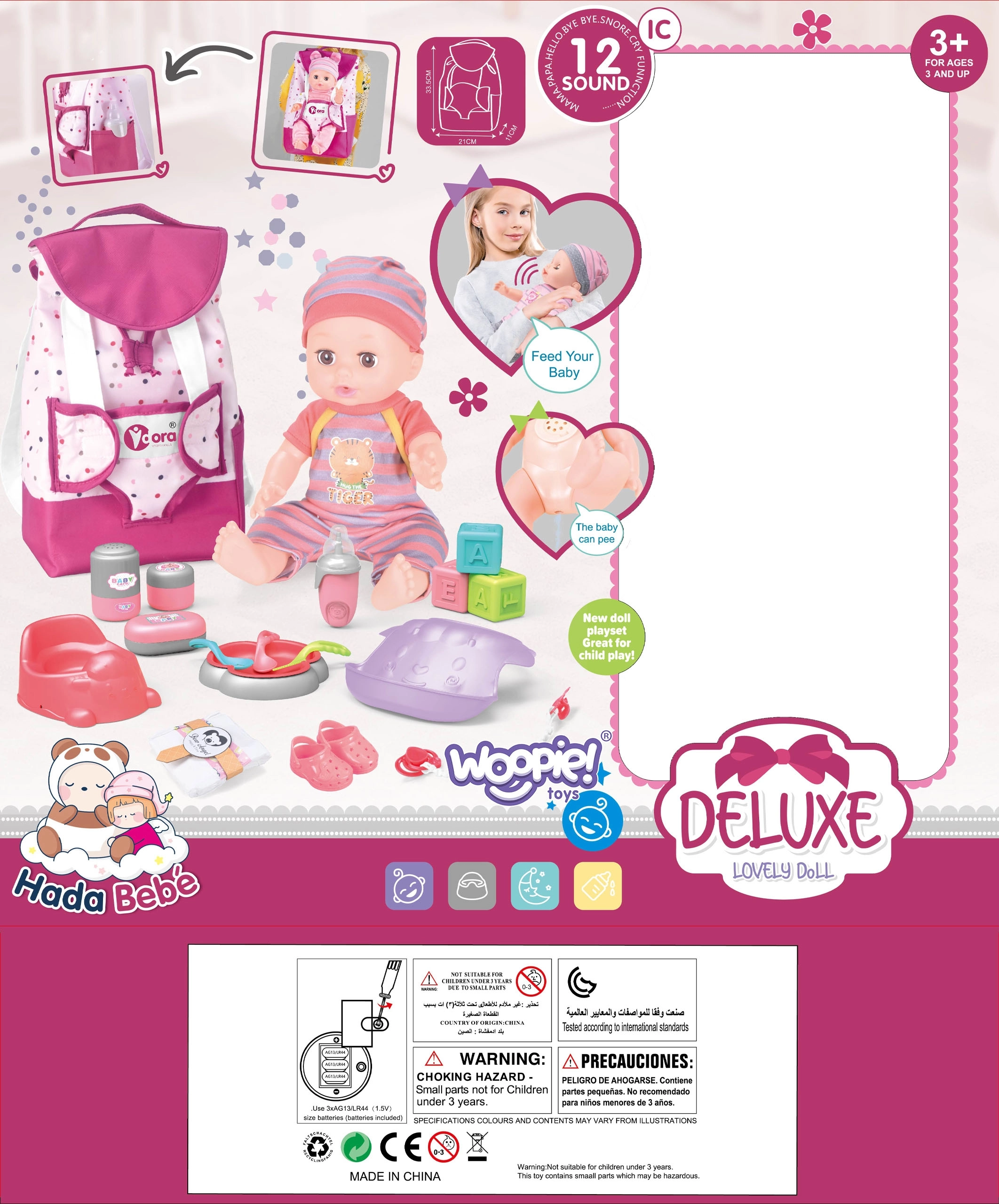 Lėlytė taip pat skleidžia 12 būdingų garsų, tokių kaip „mama“, „tėtė“, verksmas, juokas, čiaudulys ir burbėjimas, kas pradžiugins kiekvieną vaiką.