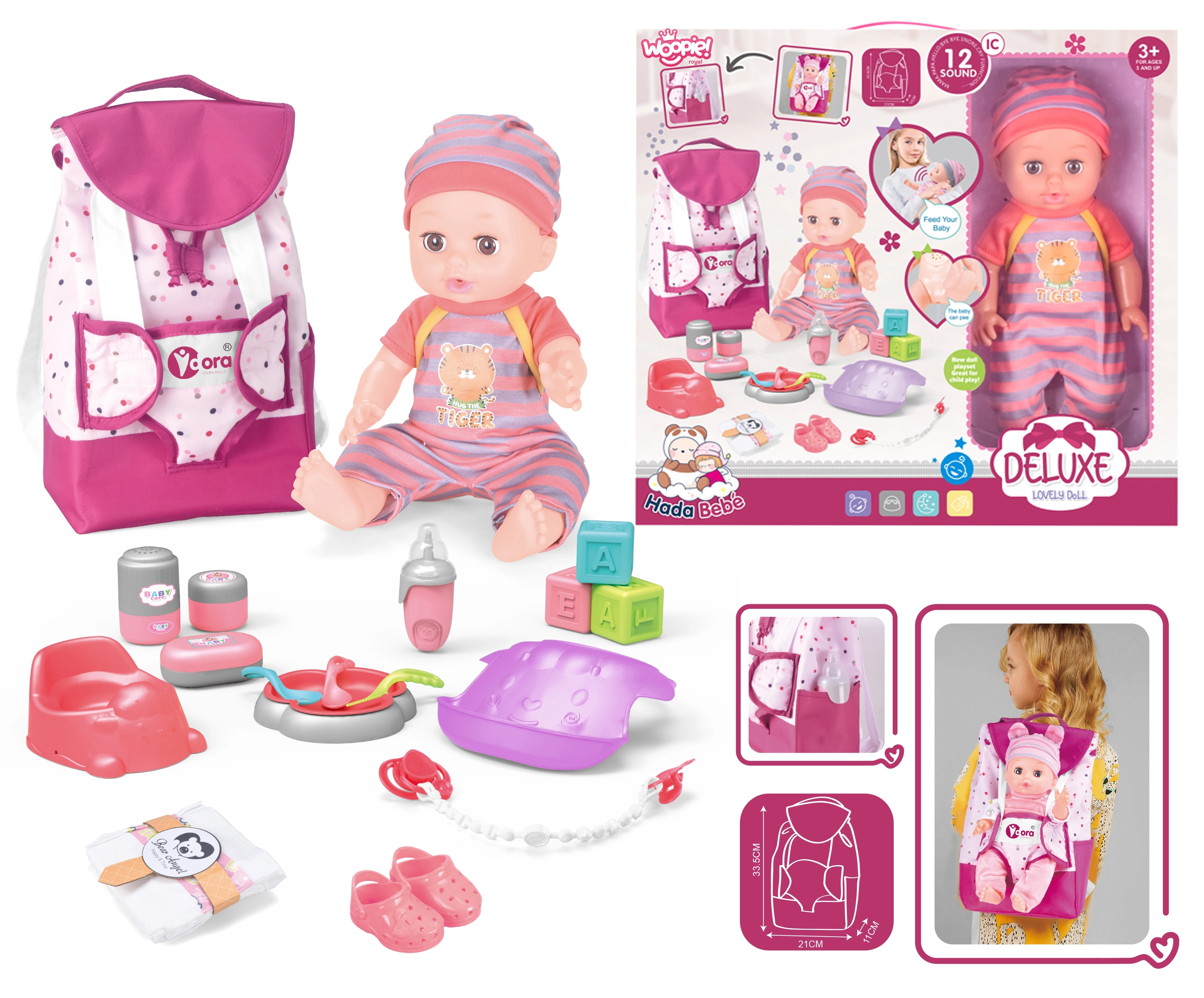 Rinkinys apima visus reikalingus priedus maitinimui, pervystymui ir aprengimui, skatinančius kūrybiškumą ir rūpestį lėlyte.