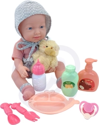 Rinkinyje yra viskas, ko reikia mažiesiems globėjams: aprengta lėlytė, čiulptukas, meškiukas, buteliukas ir valgymo rinkinys (lėkštė, šakutė, šaukštelis), papildytas dviem „kosmetikos“ buteliukais maudynių ir priežiūros scenarijams. Lėlytė turi minkštas, gumines judančias galūnes ir plastikinį kūnelį be pliušinės užpildo.
