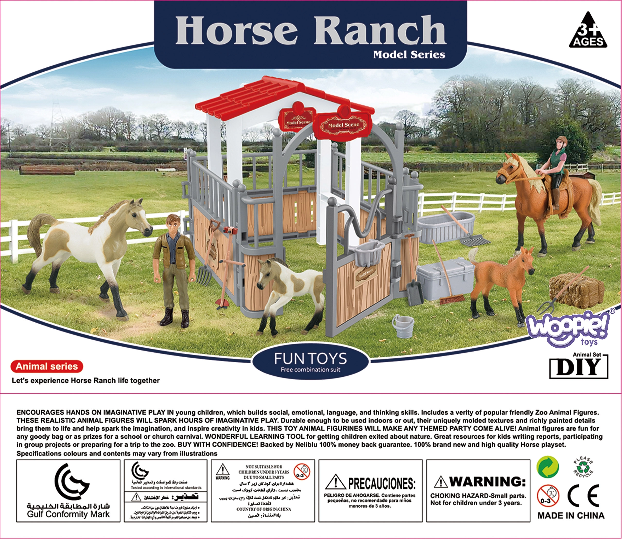 Atraskite kūrybišką kaimo pasaulį su Woopie arklidės ir arklių aptvaro rinkiniu. Pakuotėje rasite 2 arklių figūrėles, raitininkę, šieną ir praktinius priedus arklių priežiūrai. Arklidė turi klasikinę išvaizdą, yra detaliai pagaminta, o atskiros dalys labai patvarios. Žaidimas skatina vaikų vaizduotę ir kūrybiškumą bei ugdo ryšį su gamta.