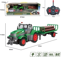- RC traktorius su akumuliatoriumi, priekaba su 5 rąstais, USB įkroviklis, nuotolinio valdymo pultas