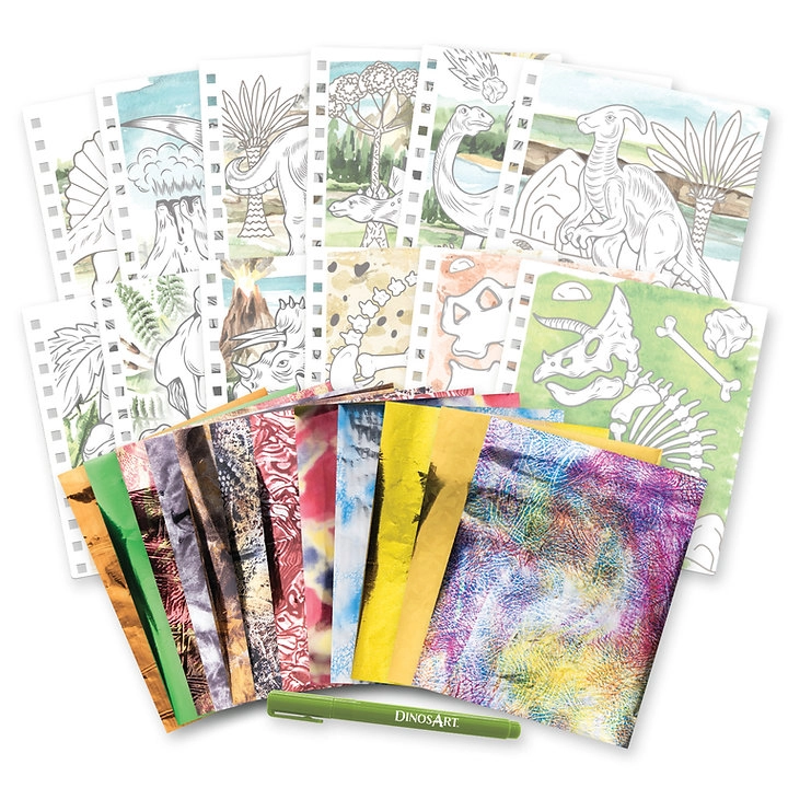 DinosArt folijinių piešimo lapų rinkinys jungia smagų kūrybą ir dinozaurų pasaulio pažinimą. Dėka folijinio klijuojamo rašiklio ryškios folijos lengvai perkeliamos ant pažymėtų vietų, todėl be netvarkos sukuriami įspūdingi blizgūs vaizdai. Vaikai lavina smulkiąją motoriką, kantrybę ir kūrybiškumą.