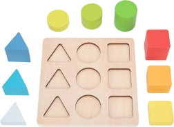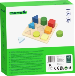 Medinė dėlionė iš prekės ženklo TOOKY TOY moko vaikus atpažinti figūras ir spalvas bei lavina smulkiąją motoriką, loginį mąstymą ir akių–rankų koordinaciją. Vaikas deda 9 spalvingus detales – trikampius, kvadratus ir apskritimus – į teisingas angas lentelėje. Puiki pramoga ir atminties bei susikaupimo treniruotė patiems mažiausiems.