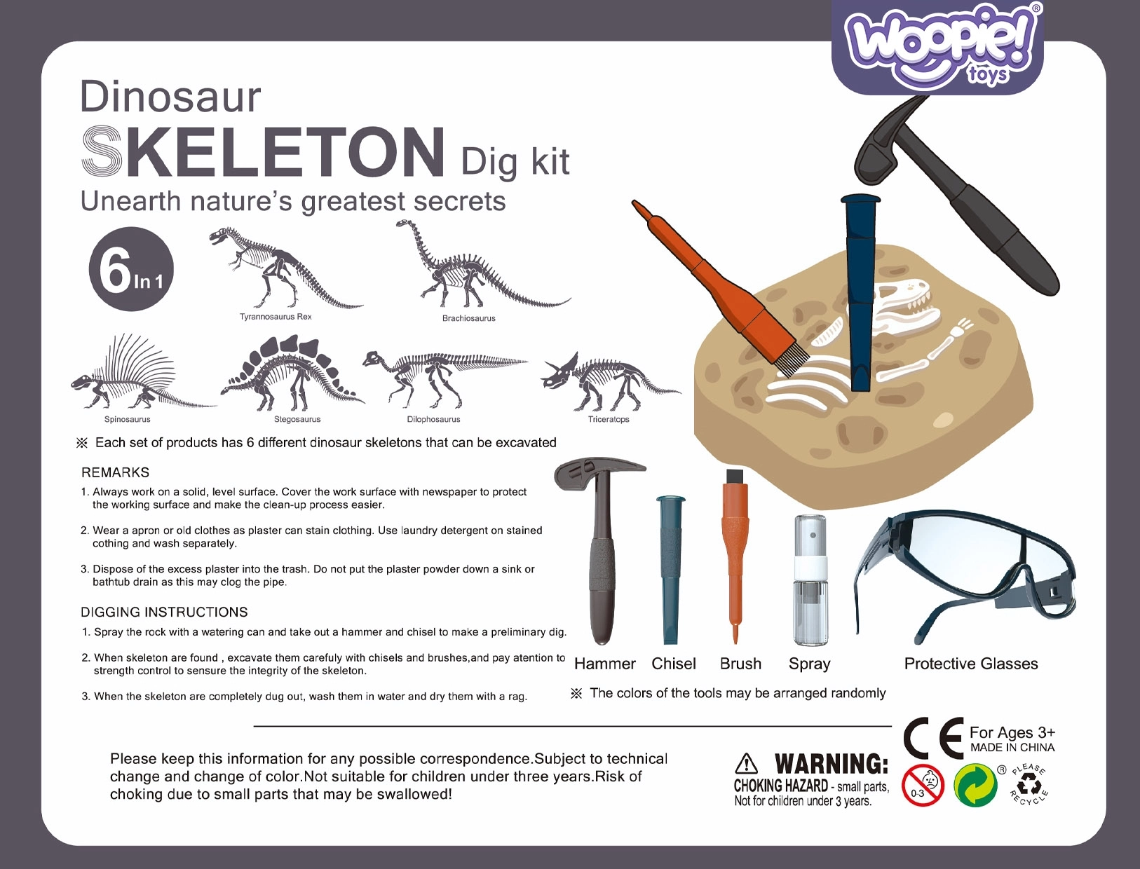 Atraskite paleontologijos žavesį su Woopie Mažasis archeologas rinkiniu. Vaikai patirs ir pramogą, ir mokymąsi viename, kai iš gipso atsargiai atkas ir surinks 6 realistinius dinozaurų skeletus. Praktiški įrankiai ir apsauginiai akiniai užtikrins saugius ir įtraukiančius namų eksperimentus, kurie lavina kantrybę, smulkiąją motoriką ir loginį mąstymą.
