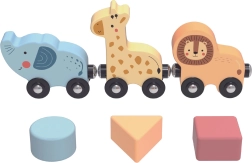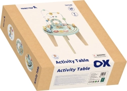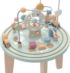 Šis kokybiškas medinis staliukas atveria vaikams spalvų ir formų pasaulį. Dviejų takelių motorinis labirintas lavina pirštų miklumą, formų rūšiuoklis moko atpažinti formas ir spalvas, krumpliaračiai ugdo loginį mąstymą ir priežastinius ryšius, o traukinukas su mielais gyvūnėliais važinėja aplink staliuką.