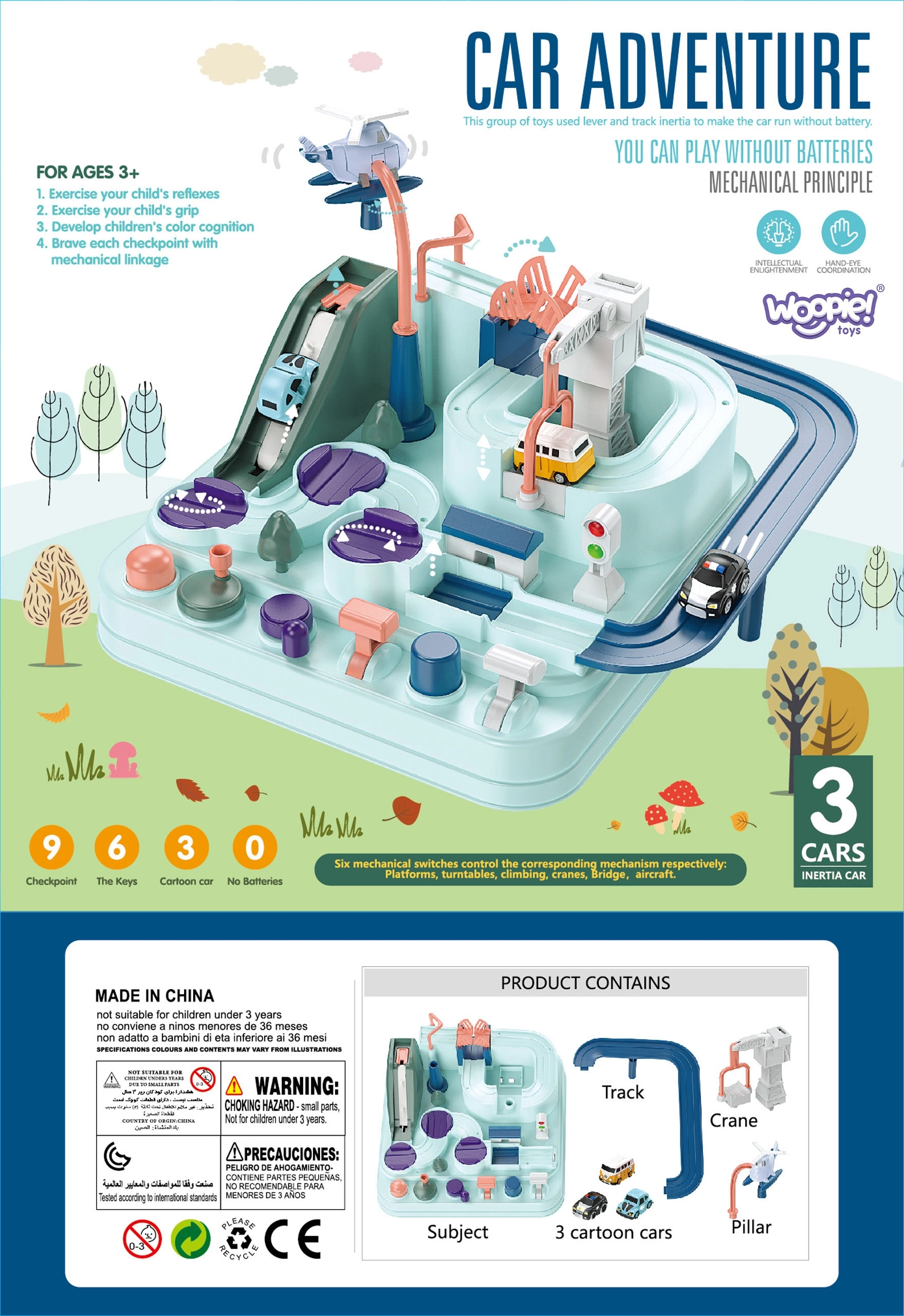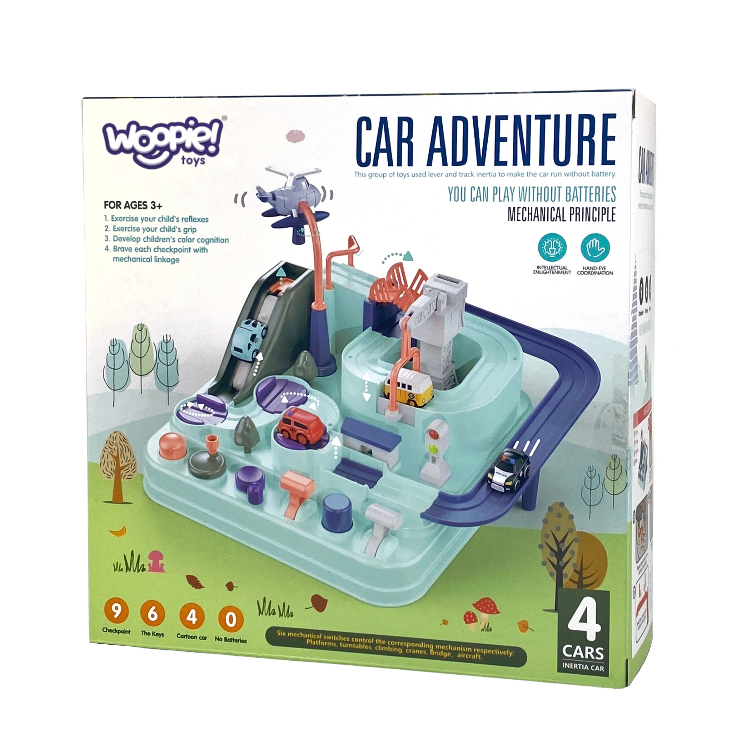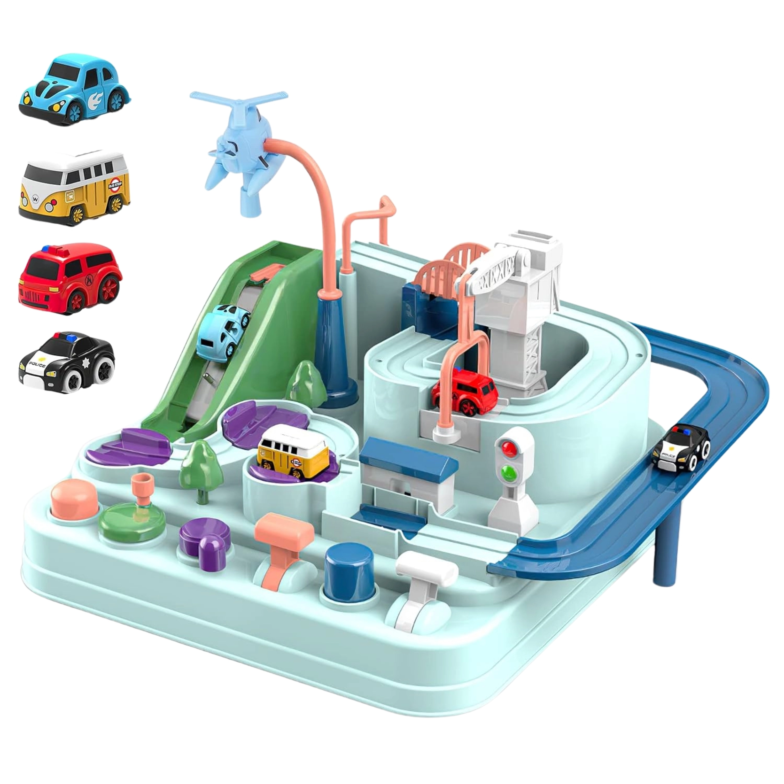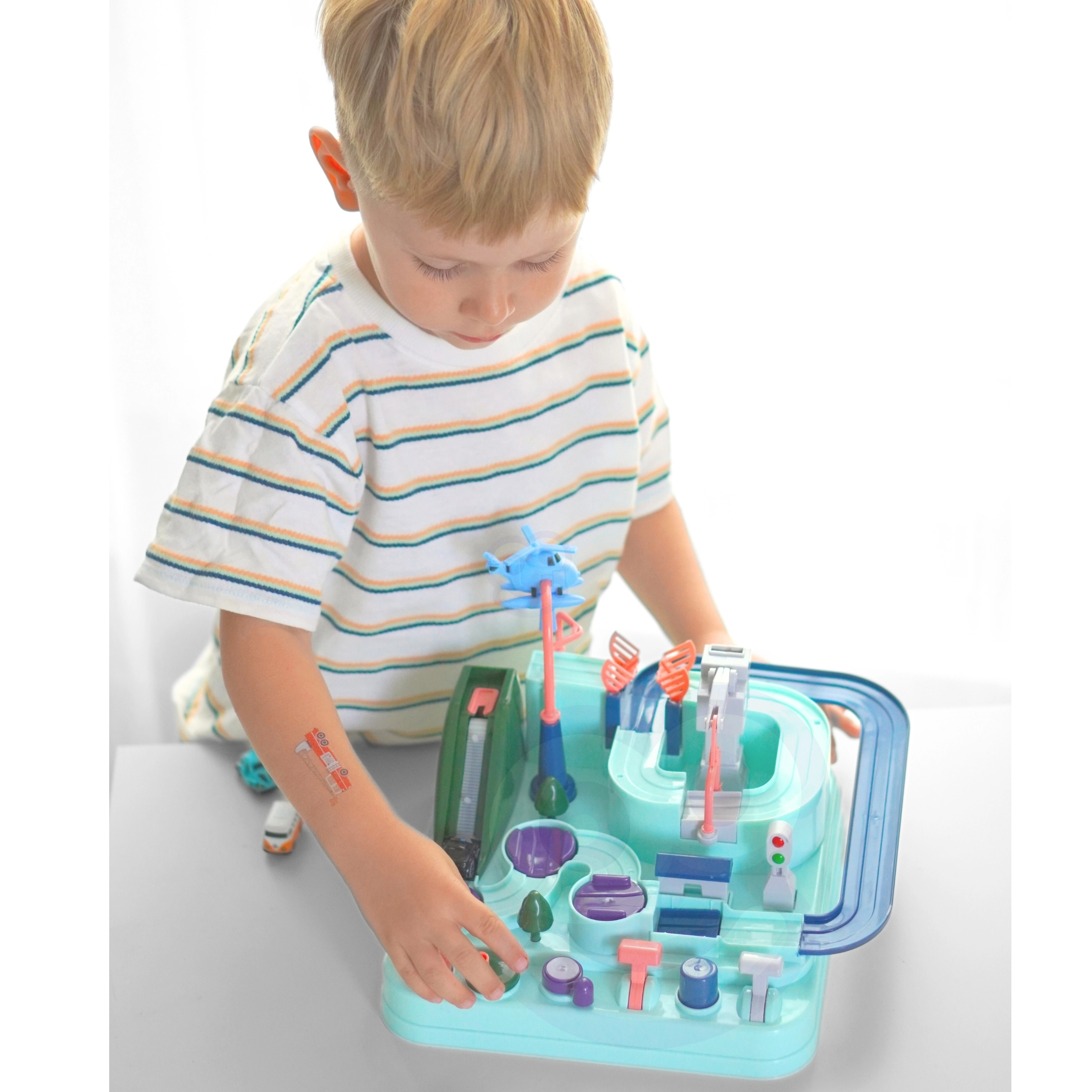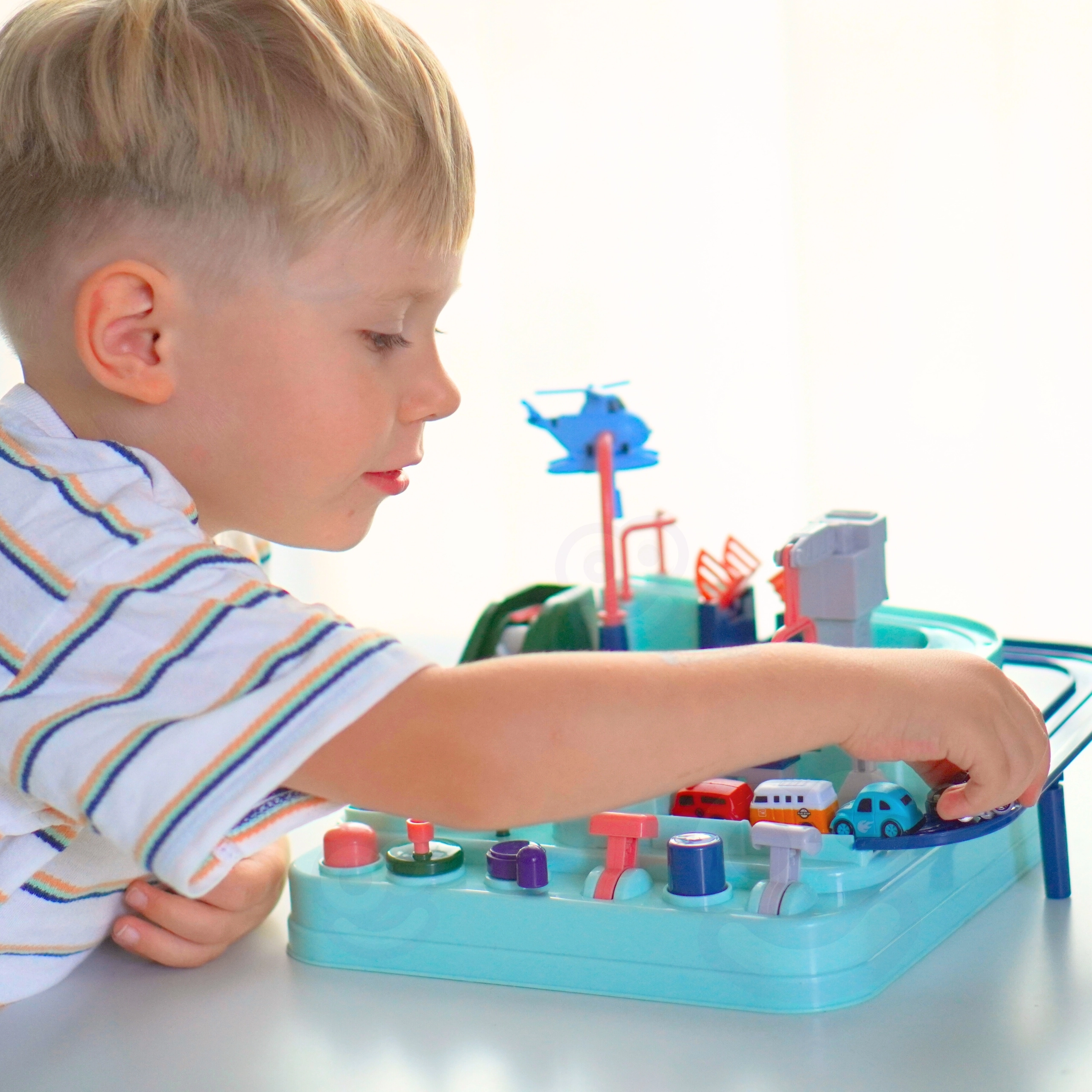 Rinkinyje yra trys maži automobiliai, kurie gali laisvai tyrinėti trasą pagal mažojo žaidėjo fantaziją. Transporto priemonės paįvairins žaidimą arba leis vaikams varžytis trasoje. Kelias per trasą gali pasirodyti paprastas, tačiau tokie elementai kaip pavarų mechanizmai ar pakeliami tiltai užtikrina, kad kelionė bus pilna adrenalino.