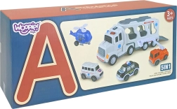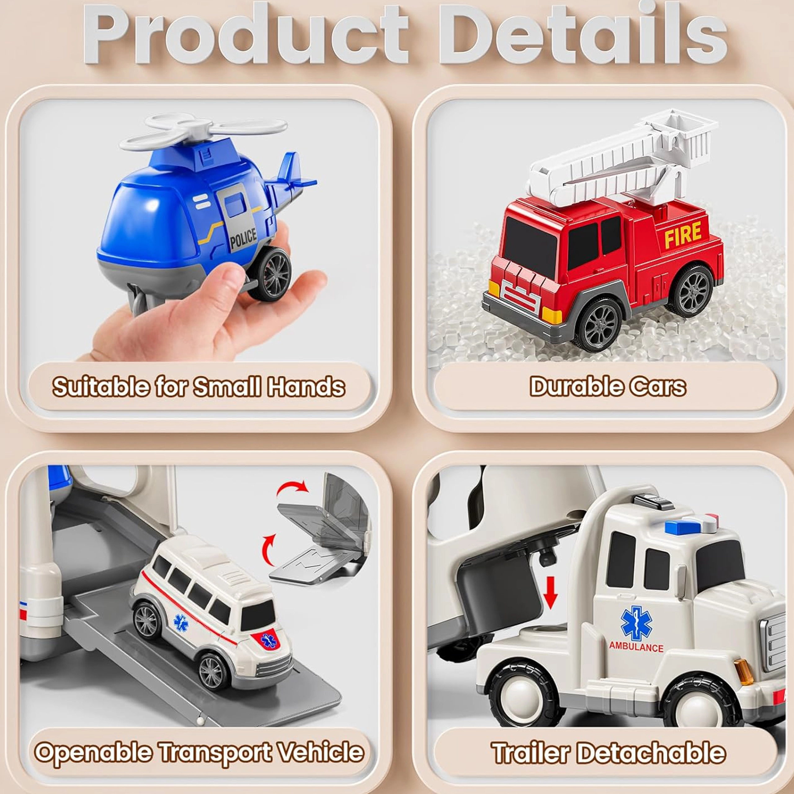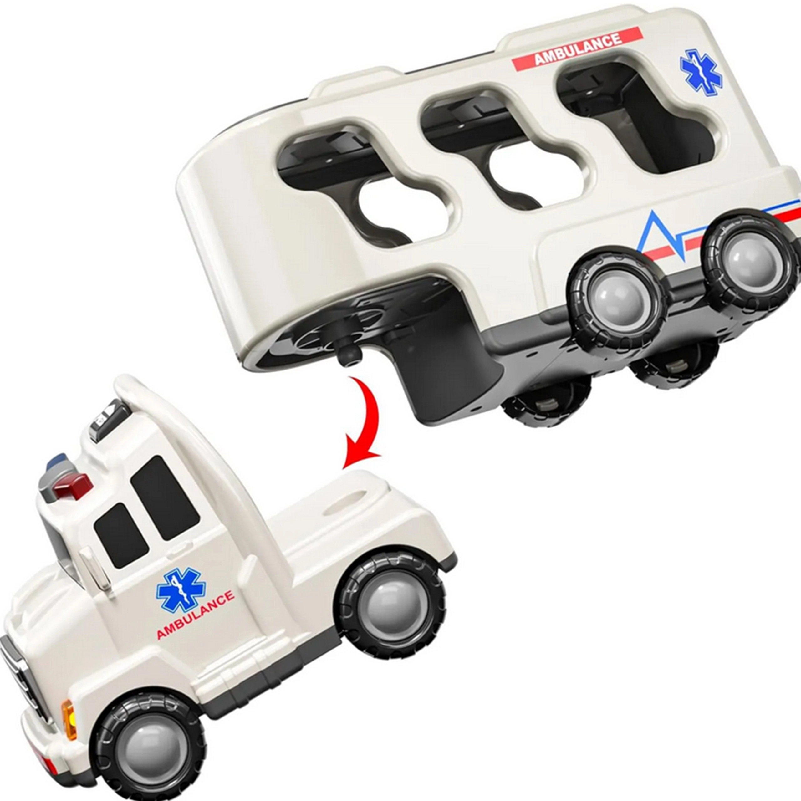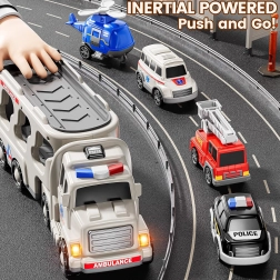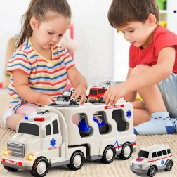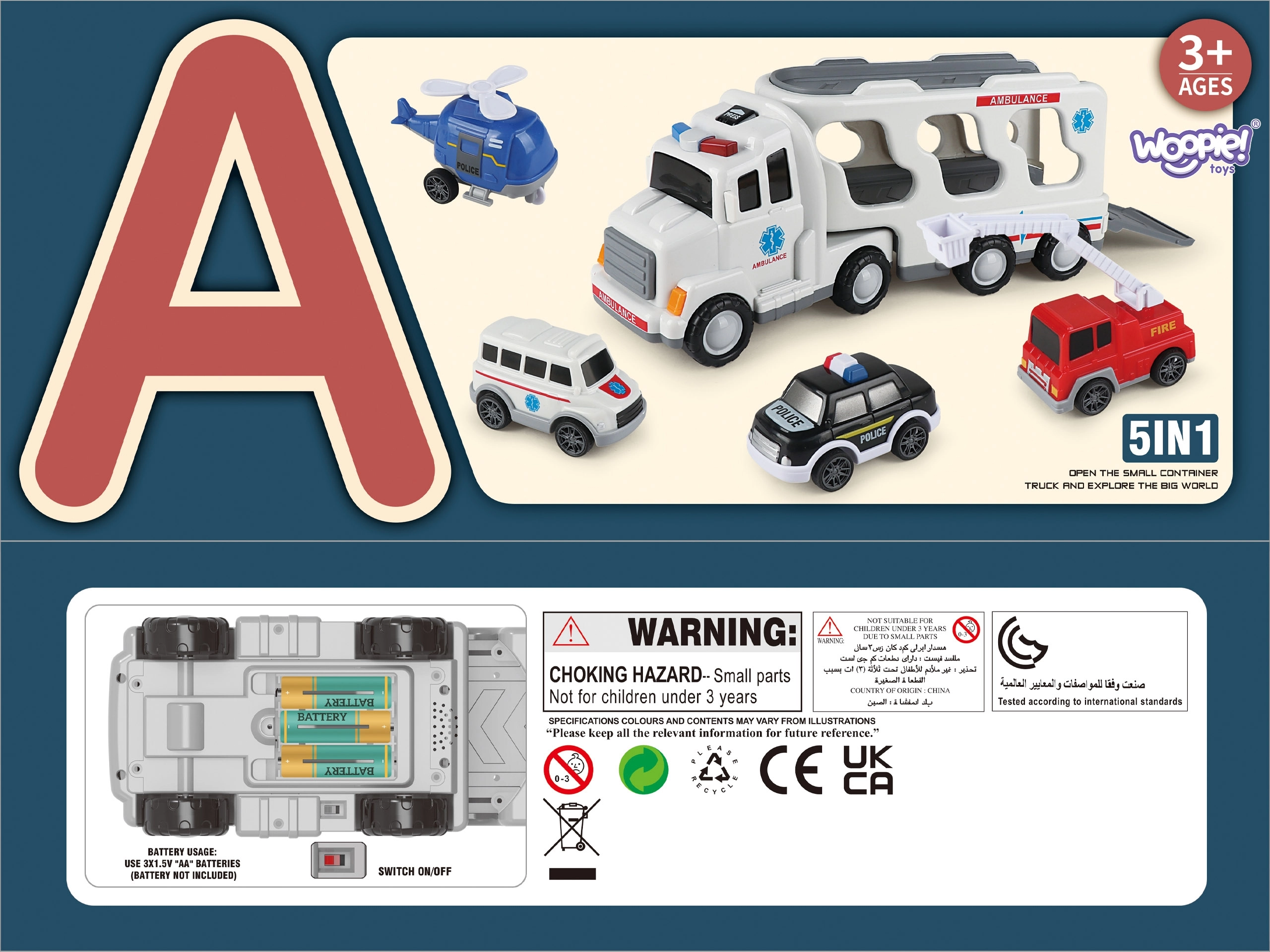 Šis interaktyvus gelbėjimo rinkinys atveria vaikams tikrų iškvietimų pasaulį: didelė transportinė greitoji/vilkikas perveža ir sutalpina visą padalinį – gaisrinę, policijos automobilį, policijos sraigtasparnį ir greitosios pagalbos automobilį. Paspaudus mygtuką ant kabinos viršaus įsijungia šviesos efektai ir sirenos, dar labiau įtraukiantys į žaidimą.