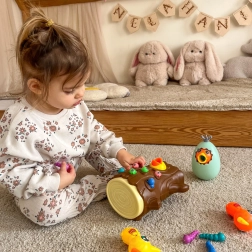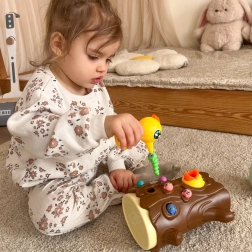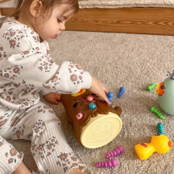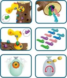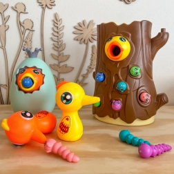 Naudodami magnetinius snapelius vaikai gaudo kirmėlytes ir maitina paukščiuką. Linksma forma lavina tikslumą, suėmimą ir akių–rankų koordinaciją.