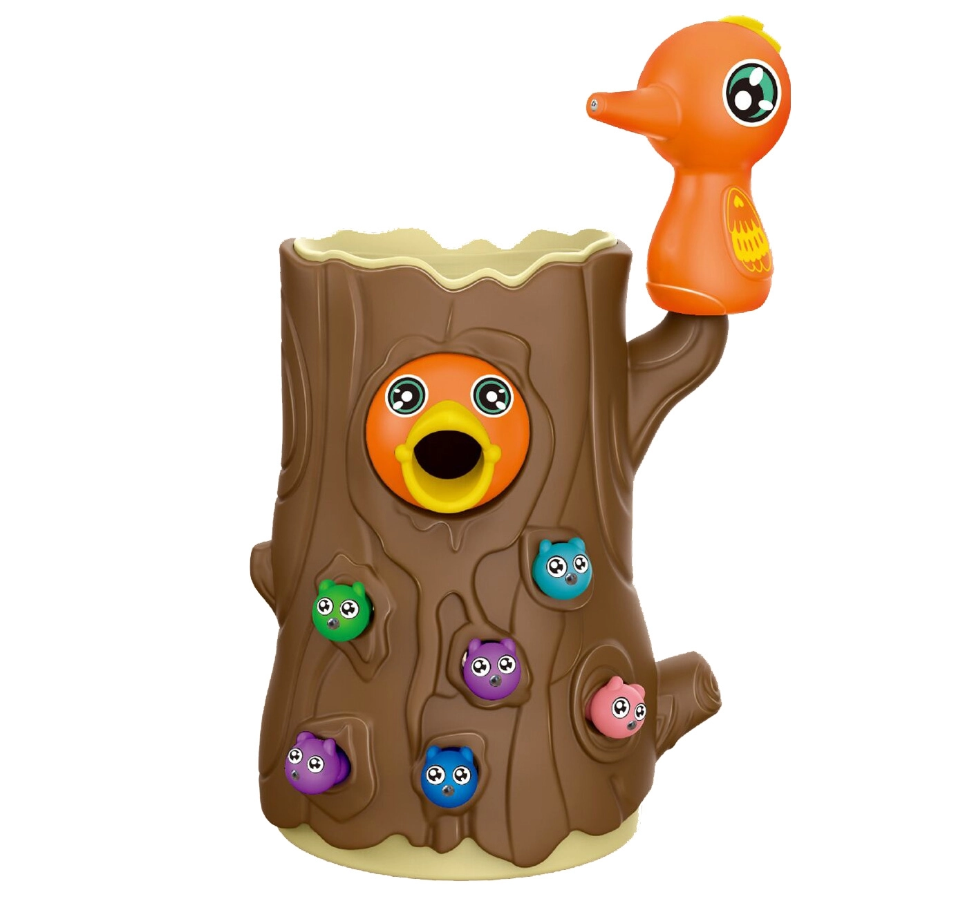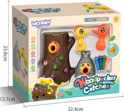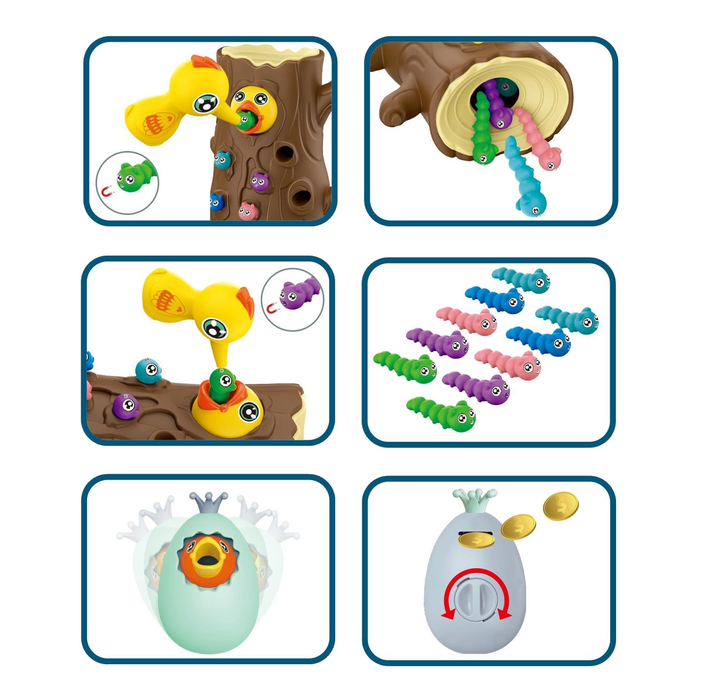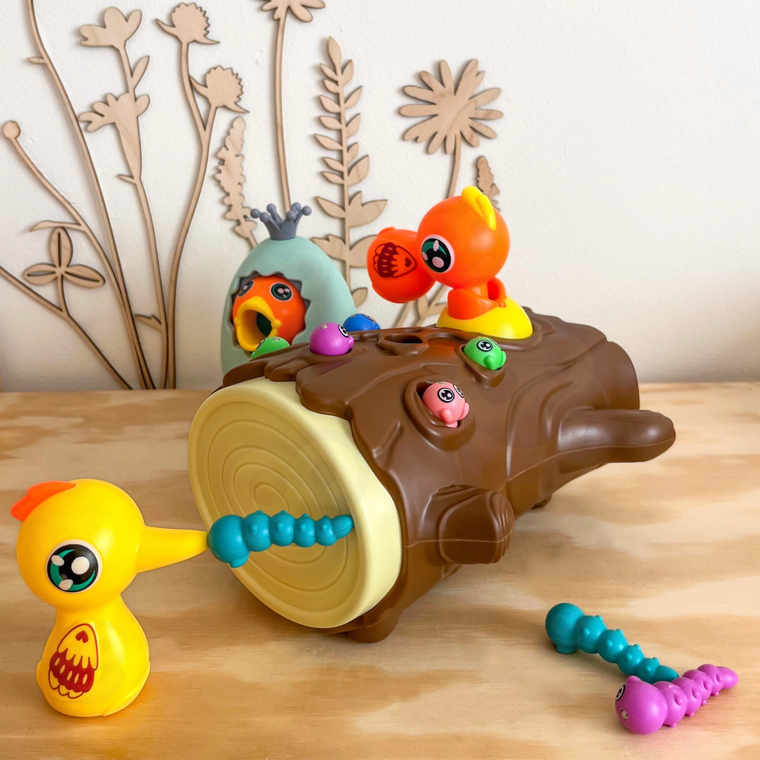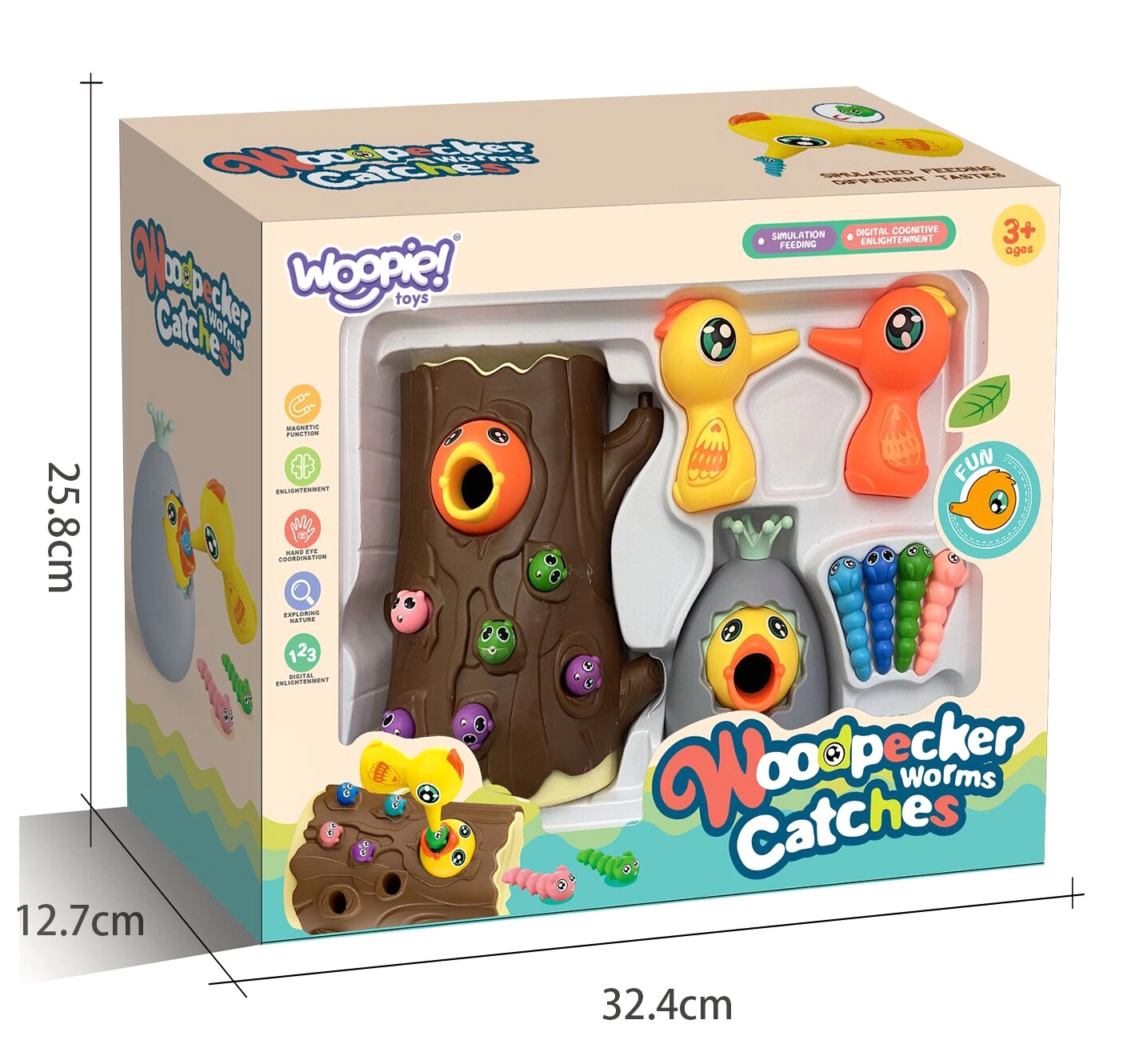 Smagus magnetinis žaidimas 3 viename iš WOOPIE sujungia mokymąsi per žaidimą ir šeimos pramogas. Vaikai su magnetiniais snapeliais „gaudo“ kirmėlytes ir maitina paukščiuką kelmo viduje, taip lavindami smulkiąją motoriką, akių–rankų koordinaciją ir susitelkimą. Kiaušinuką galima naudoti kaip taupyklę ir kaip virstantį žaisliuką, žaidimas puikiai tinka dviem žaidėjams ir skatina kantrybę bei tikslumą.