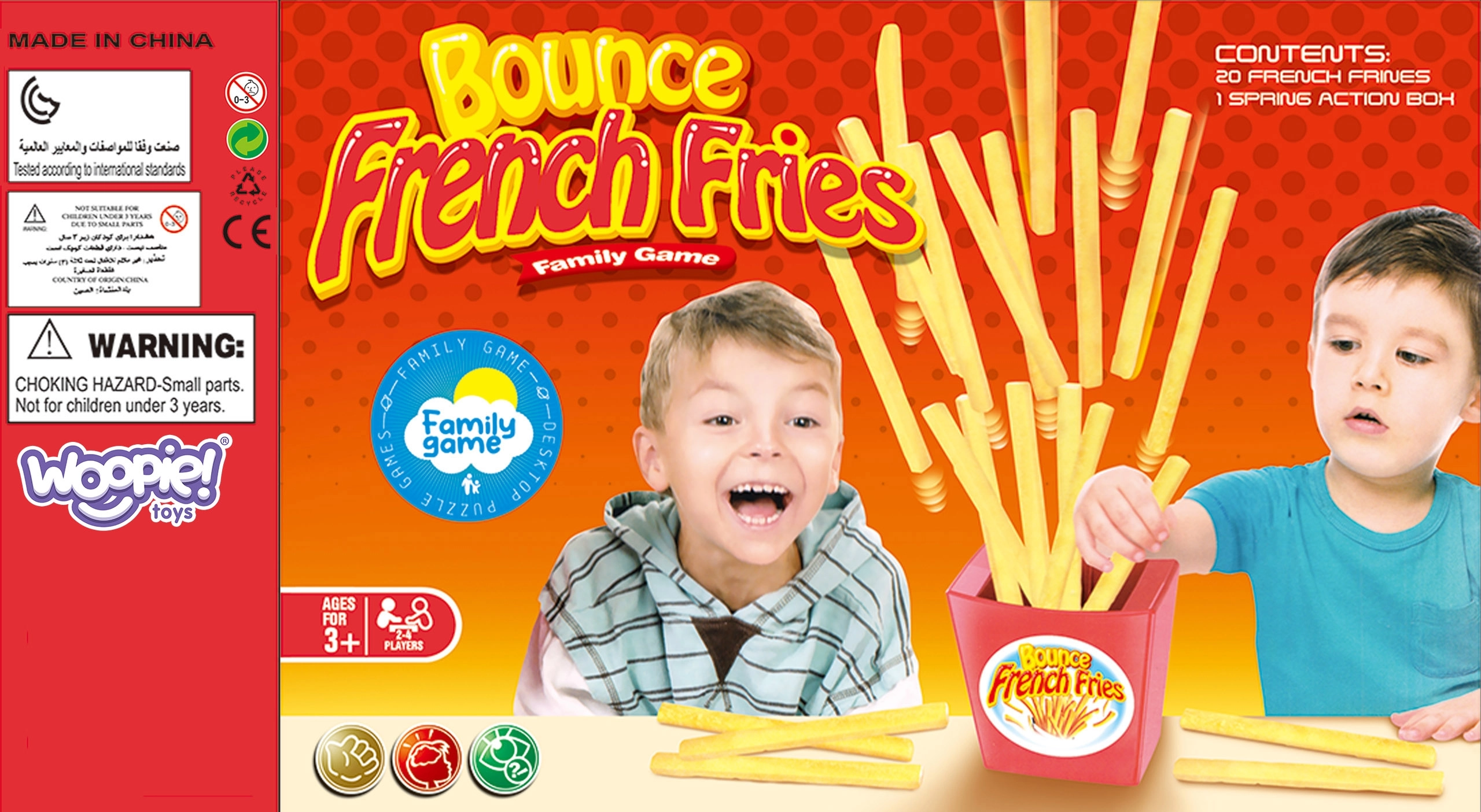 WOOPIE žaidimas Šokinėjančios bulvytės – greitas ir įtraukiantis vakarėlių žaidimas vaikams ir suaugusiesiems. Tikslas – atsargiai traukti bulvytes iš puodelio ir nesukelti jų „sprogimo“. Lengvas, kompaktiškas ir akimirksniu suprantamas – idealus bendriems vakarams su šeima ar draugais.