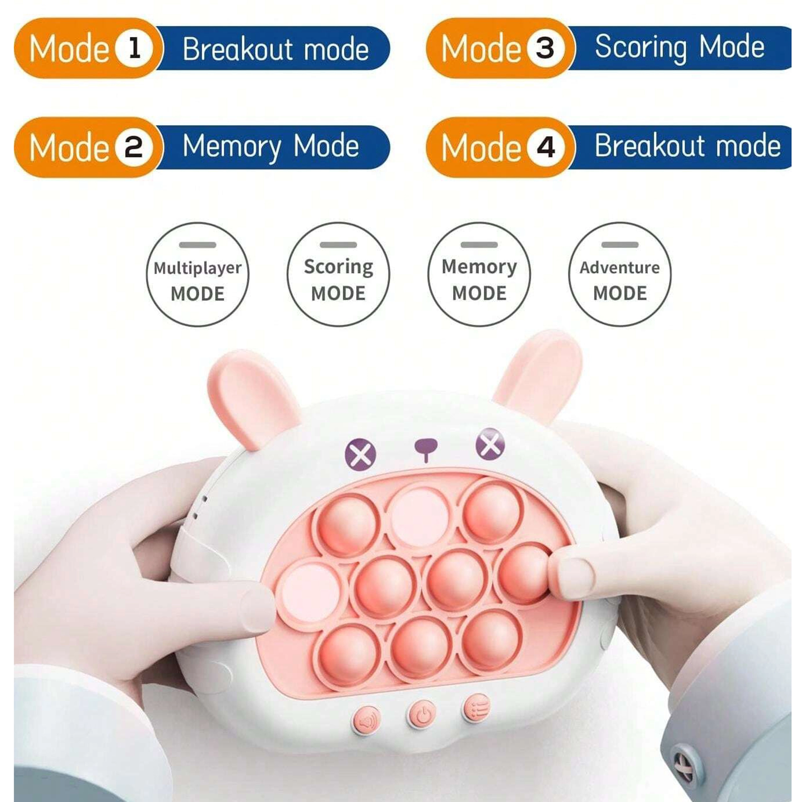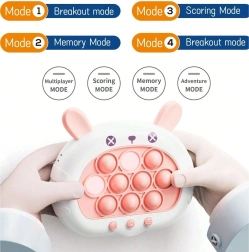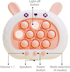 Linksmas ir interaktyvus žaidimas POP IT Zuikutis teikia džiaugsmą tiek vaikams, tiek suaugusiesiems. Lavina mąstymą, smulkiąją motoriką, akių–rankų koordinaciją ir padeda įveikti stresą. Šis žaislas siūlo keturis skirtingus žaidimo režimus, kurie išlaikys kiekvieną įsitraukusį.