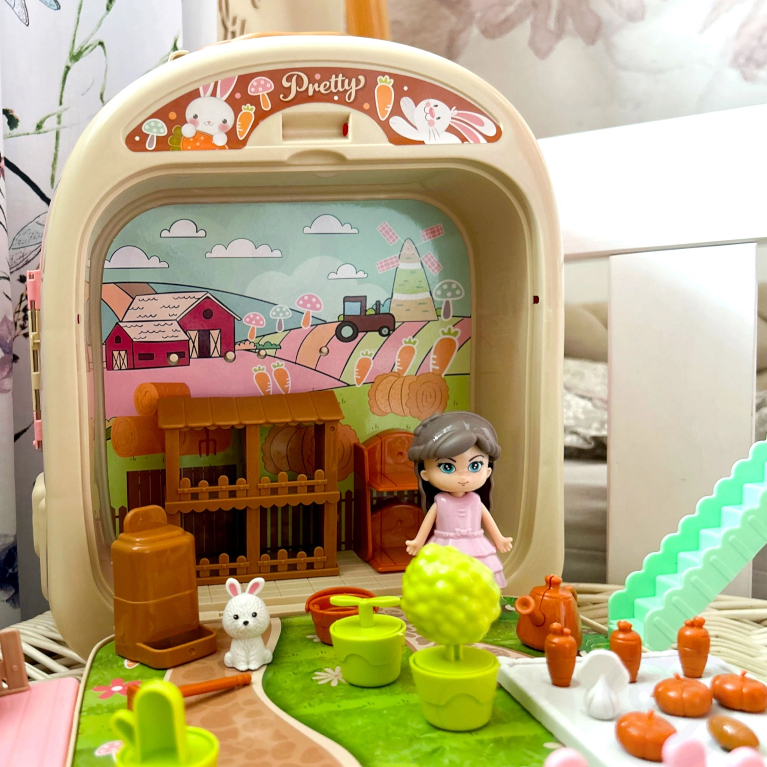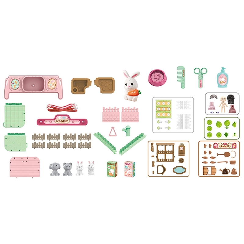 Vaikai gali žaisti ūkininkus su šiuo žaviu rinkiniu, kuris apima įvairius ūkininkavimo elementus ir triušelių priežiūrą.