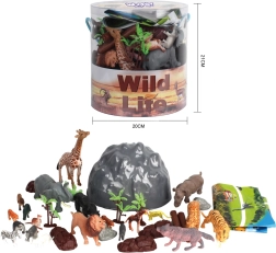 - Gyvūnų figūrėlės, priedai (medeliai, akmenys), teminis safari žemėlapis, laikymo kibirėlis