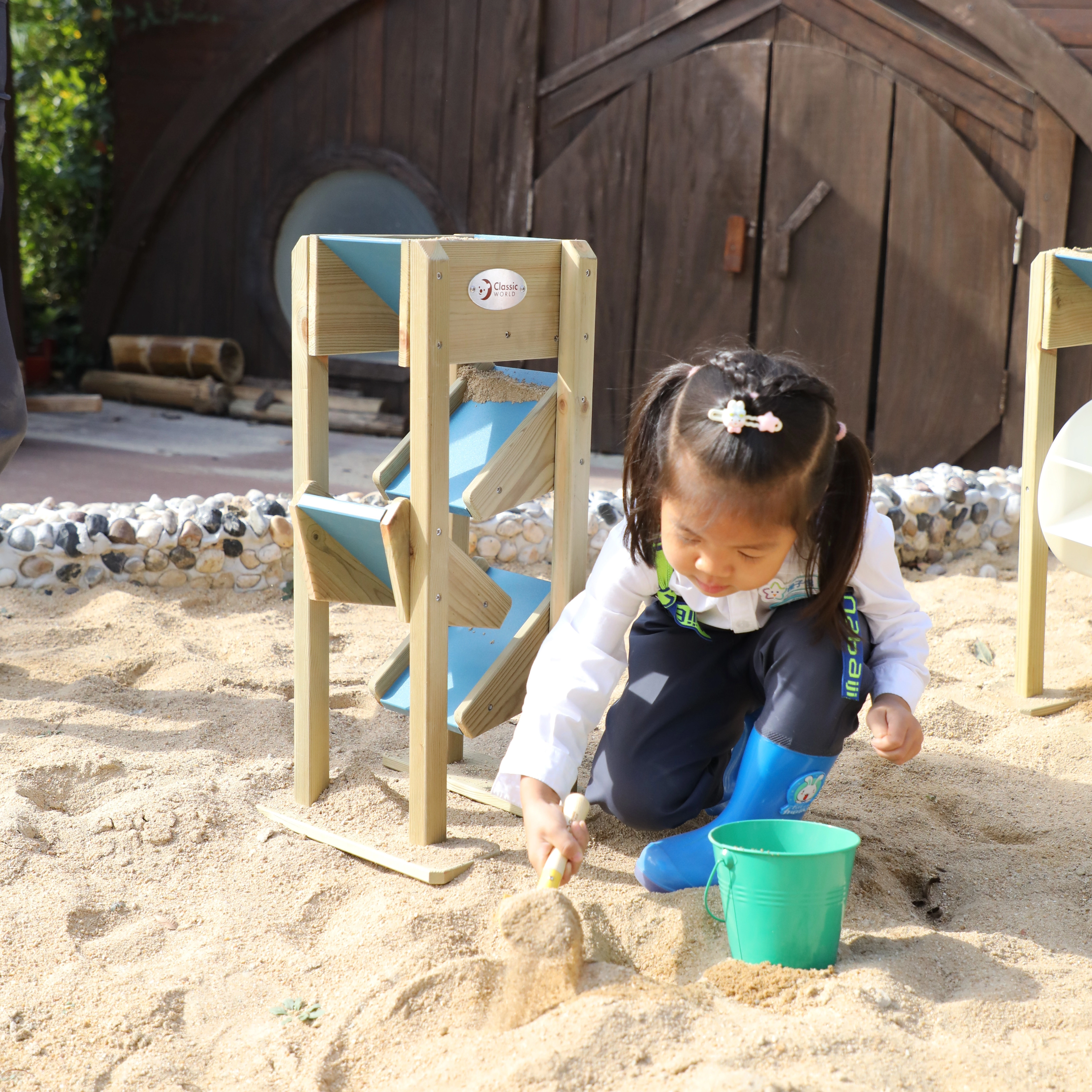 Viršuje esantis piltuvas ir trys nuosekliai sujungtos rampos sukuria įtraukiantį smėlio kelią, kuris skatina vaikus nuolat tyrinėti iš naujo.