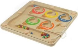 Uždara konstrukcija su skaidriu dangteliu yra saugi ir patvari – kamuoliukai lieka viduje ir niekas nepasimeta. Vaikai treniruoja smulkiąją motoriką, koordinaciją, kantrybę ir koncentraciją, stumdydami kamuoliukus spalvotais takeliais: raudona, geltona, mėlyna, žalia ir oranžinė.
