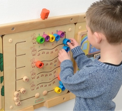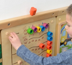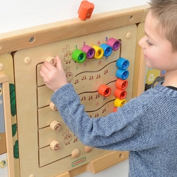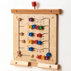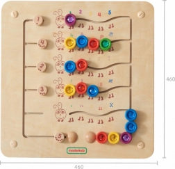 Kairėje pusėje rasite slankiklius užduotims nustatyti – taip vaikai gali treniruoti skaičiavimą aukštyn ir žemyn iki 5, sieti kiekius ir spalvas bei lavinti loginį mąstymą. Be to, kad padeda ugdyti smulkiąją motoriką ir akių–rankų koordinaciją, žaislas skatina ir koncentraciją bei vizualinę percepciją.