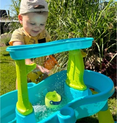 Vaikai pila vandenį į viršutinę stalo dalį ir stebi, kaip jis teka per vandens malūnėlius ir angas, sukeldamas linksmus vandens efektus.