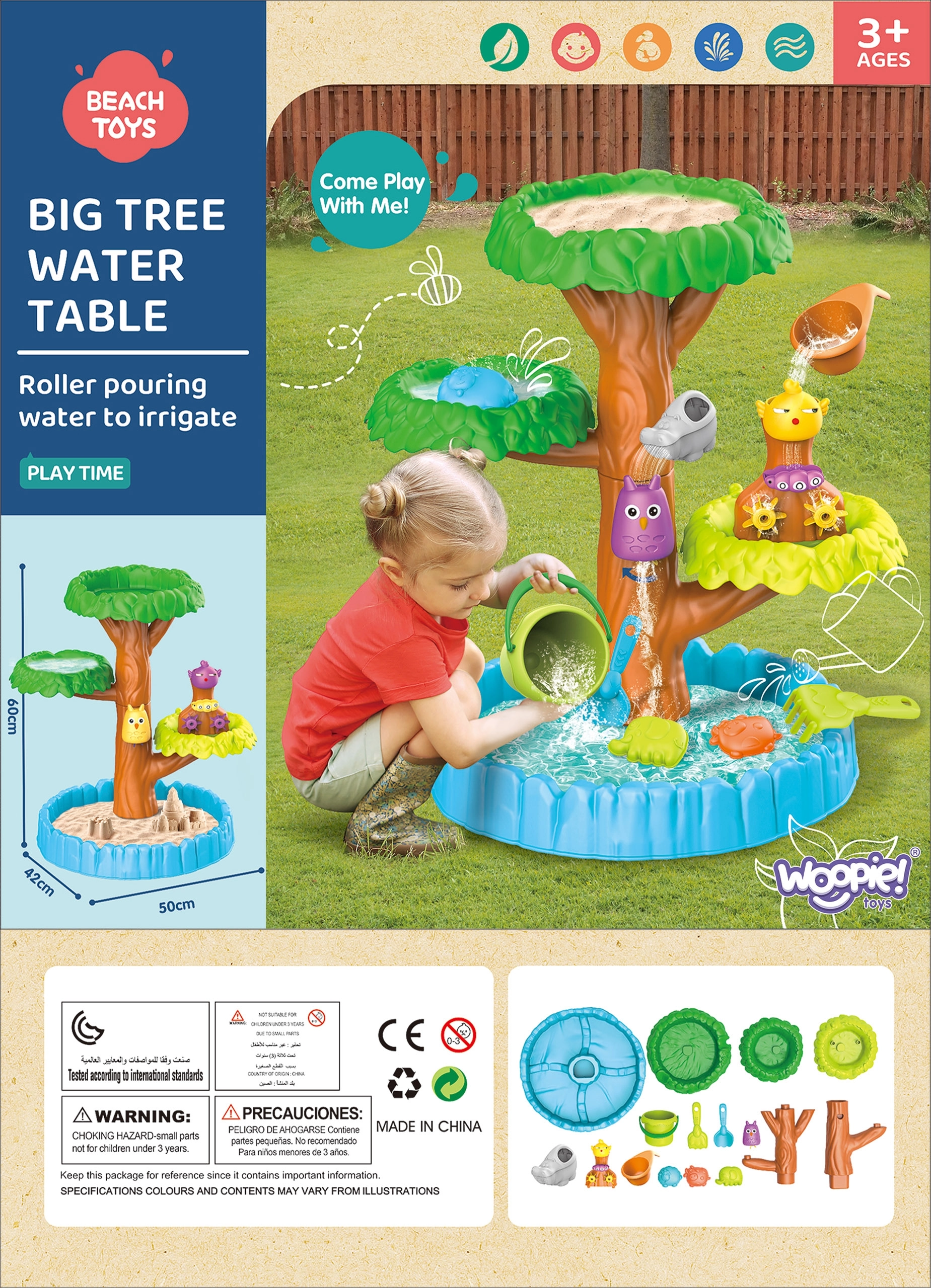 Vandens stalas medžio formos iš Woopie prekės ženklo – puikiai tinka žaidimams su vandeniu ir smėliu. Šiame rinkinyje yra viskas, ko reikia begalinei pramogai – sulankstomas stalas, kibiras, pyliklis, trys formelės, du kastuvėliai, laistytuvas. Vaikas gali laistyti vandenį ant įvairių gyvūnėlių, dėl ko krumpliaračiai ima suktis, suteikdami dar daugiau džiaugsmo jau ir taip puikiam žaidimui.