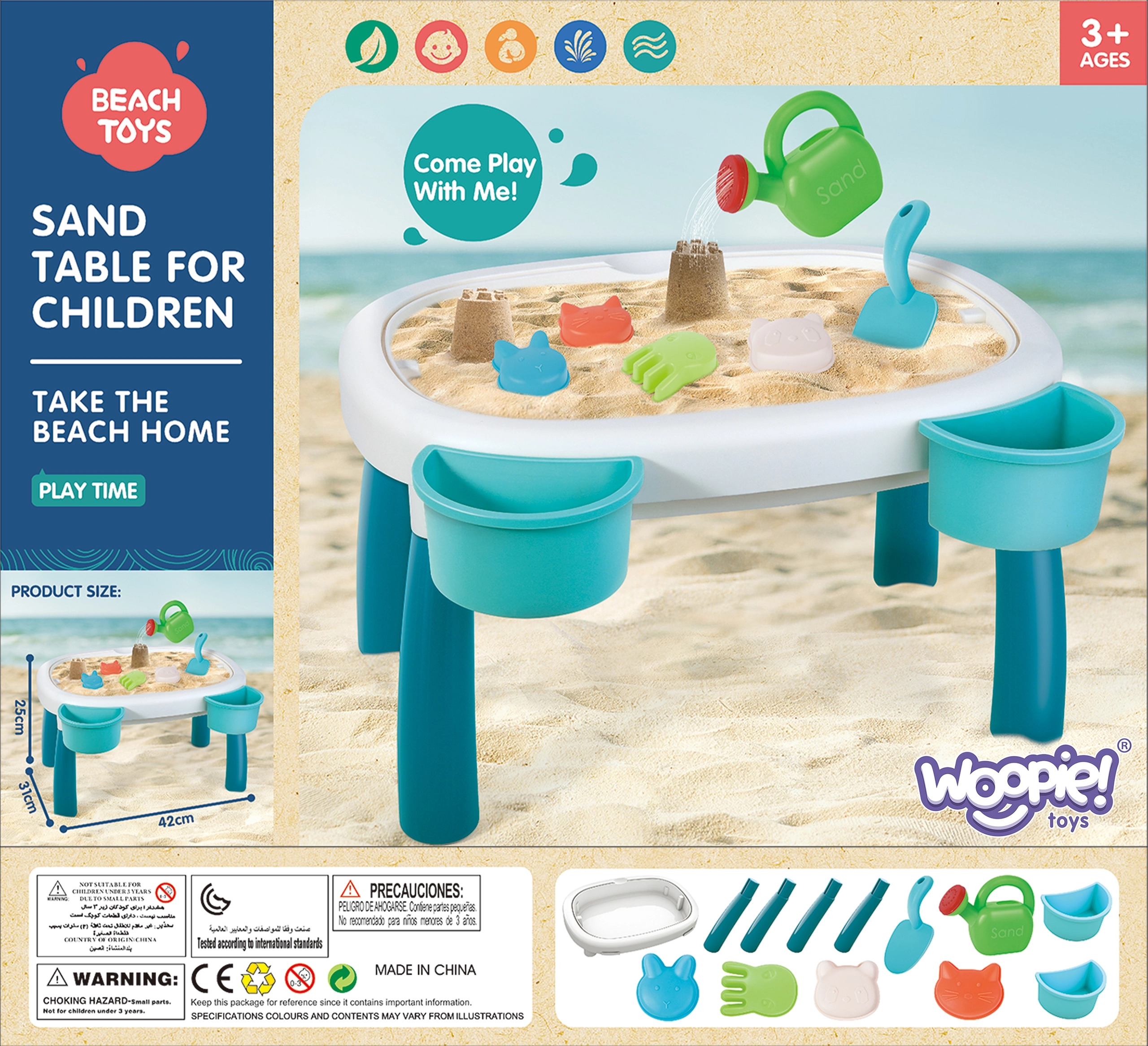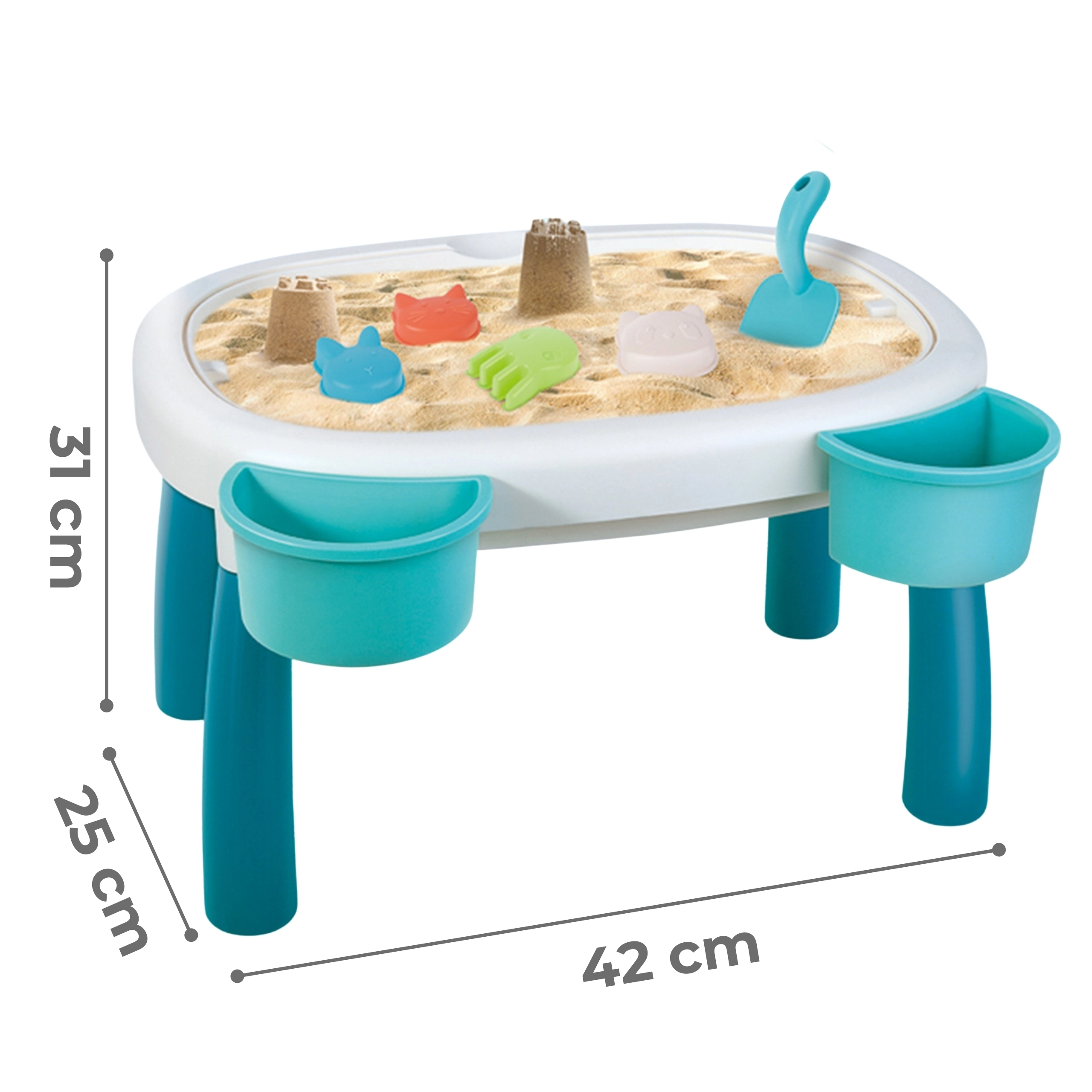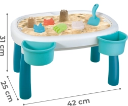 Rinkinyje yra 7 praktiški priedai – laistytuvas, semtuvėlis, 4 formelės (aštuonkojis, katė, panda, triušiukas) ir dvi į staliuką dedamos talpos. Jų dėka vaikai gali kurti smėlio statinius, pilstyti vandenį ir lavinti kūrybiškumą bei rankų įgūdžius.