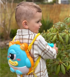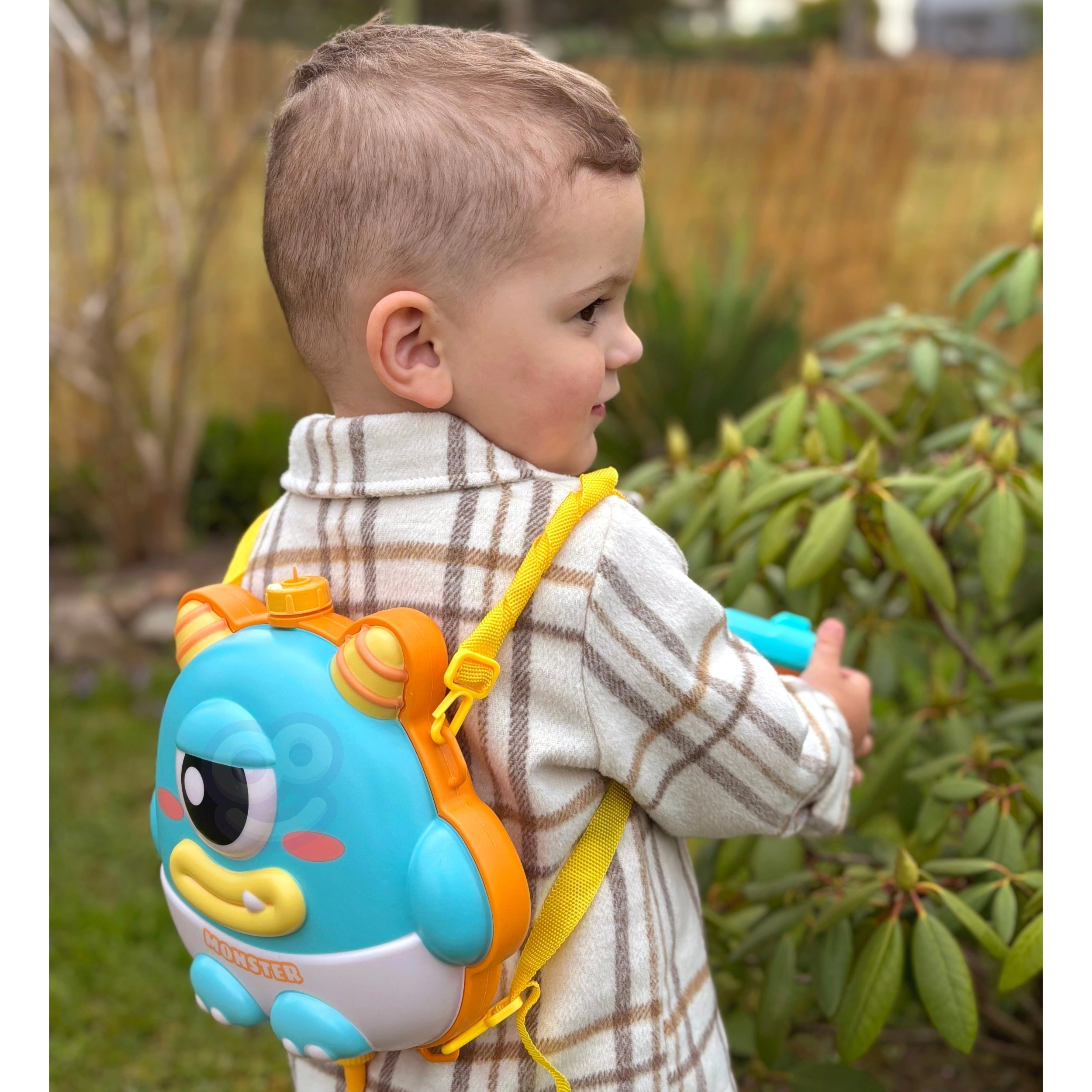 Mielas monstriuko motyvo kuprinė ir lengvas pistoletas, sujungti žarnele, sudaro idealų rinkinį karštoms dienoms sode, prie vandens ar atostogose. Didelė 2,1 litro talpykla pratęsia žaidimą, o reguliuojamas purkštukas leidžia perjungti tarp purškimo ir stiprios čiurkšlės. Dėl įkraunamos baterijos nereikia pompuoti – tiesiog įkraukite, nusitaikykite ir šaudykite.