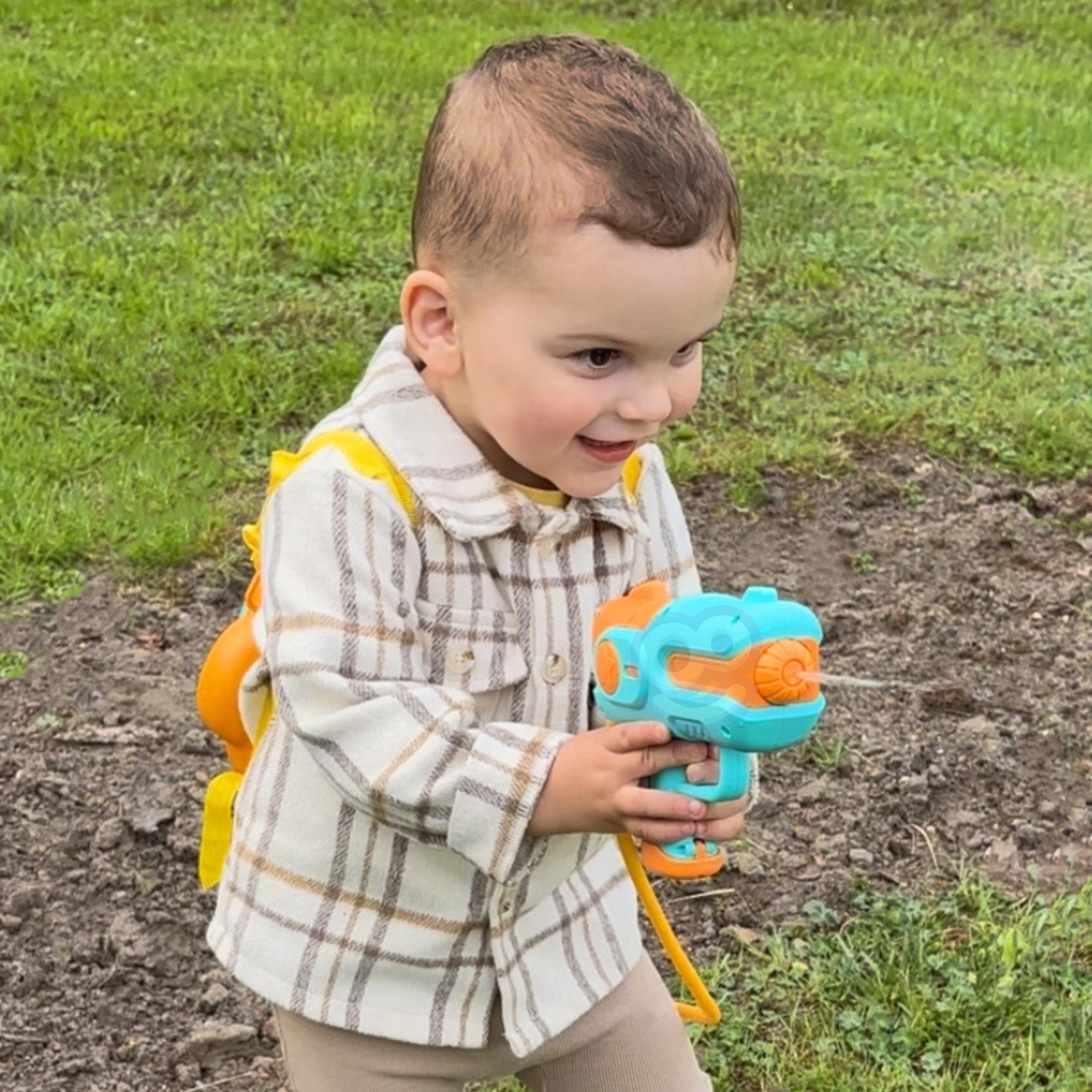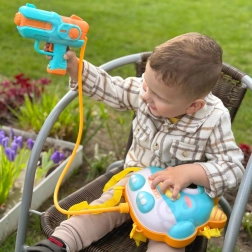 Saugi ir linksma konstrukcija tinkama vaikams nuo 3 metų. Reguliuojami kuprinės dirželiai prisitaiko prie įvairių ūgių, o lengva konstrukcija palengvina nešiojimą ir ilgesnį žaidimą. 5–8 m nuotolis užtikrina įtemptus vandens mūšius ir daug juoko.