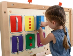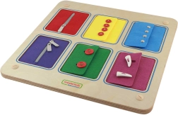 Ši kokybiška medinė edukacinė lenta suteikia vaikams saugią erdvę tikriems užsegimo mechanizmams išbandyti. Kiekviena iš 6 horizontalių kišenių atspindi skirtingą iš striukių, džemperių ar marškinių pažįstamą užsegimo tipą, todėl vaikai mokosi įgūdžių, kuriuos pritaiko kasdien.