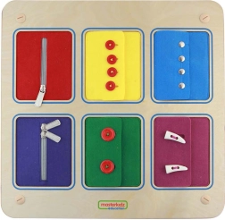 Lavinkite vaikų sumanumą su medine Montessori lenta MASTERKIDZ. Šešios spalvotos tekstilinės kišenės imituoja drabužių užsegimą ir moko praktinių įgūdžių: užtrauktukai, sagos, spaudės ir dvipusis užtrauktukas. Patvarus medinis korpusas ir prasmingas žaidimas skatina smulkiąją motoriką, akių–rankų koordinaciją ir savrankiškumą.