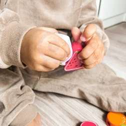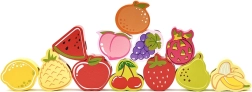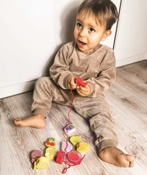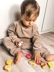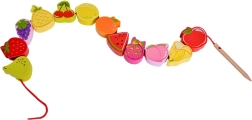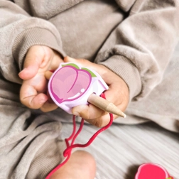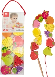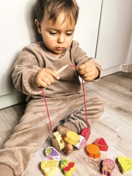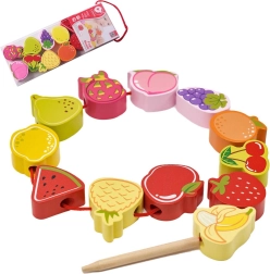 Šis medinis vėrimo rinkinys su vaisių motyvais – puiki priemonė smalsiems mažyliams nuo 18 mėnesių. Naudodami medinę adatą vaikai veria spalvingus vaisius ant virvelės ir taip natūraliai lavina smulkiąją motoriką, kantrybę ir loginį mąstymą. Kartu žaismingai mokosi spalvų ir vaisių pavadinimų.