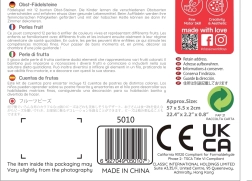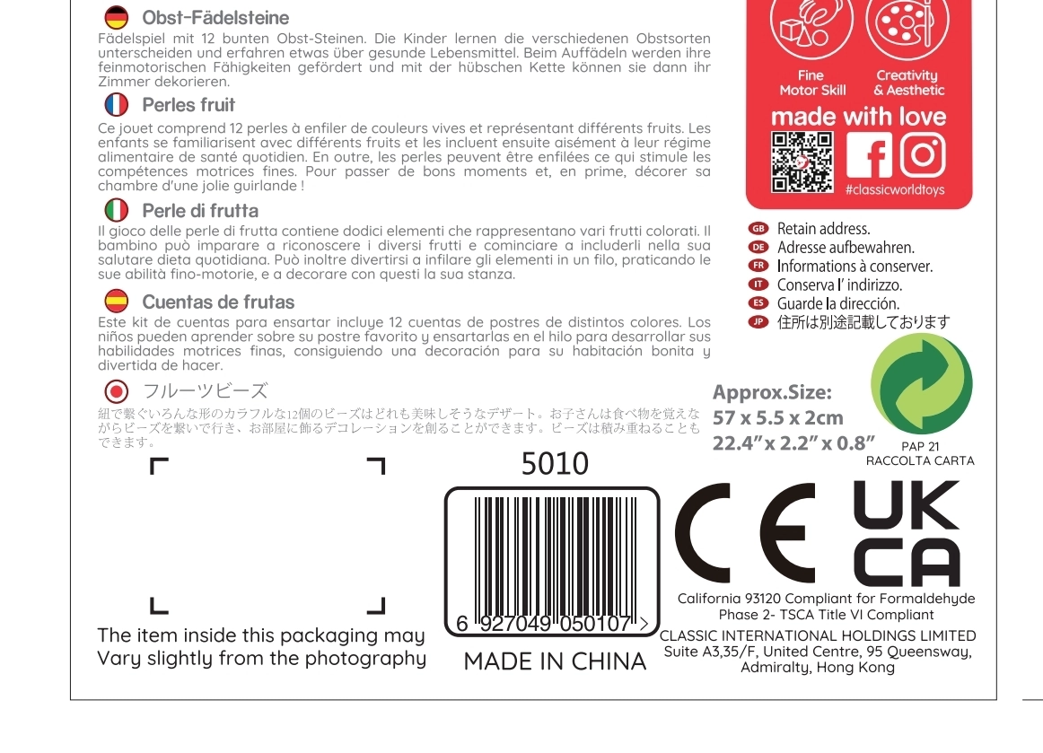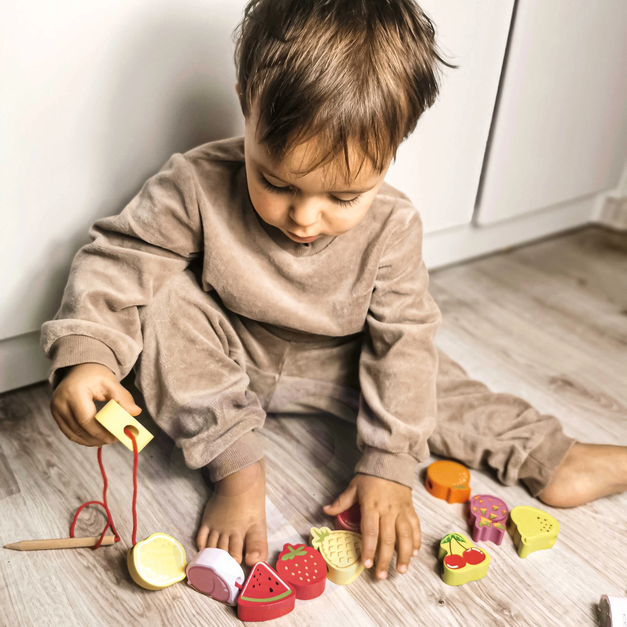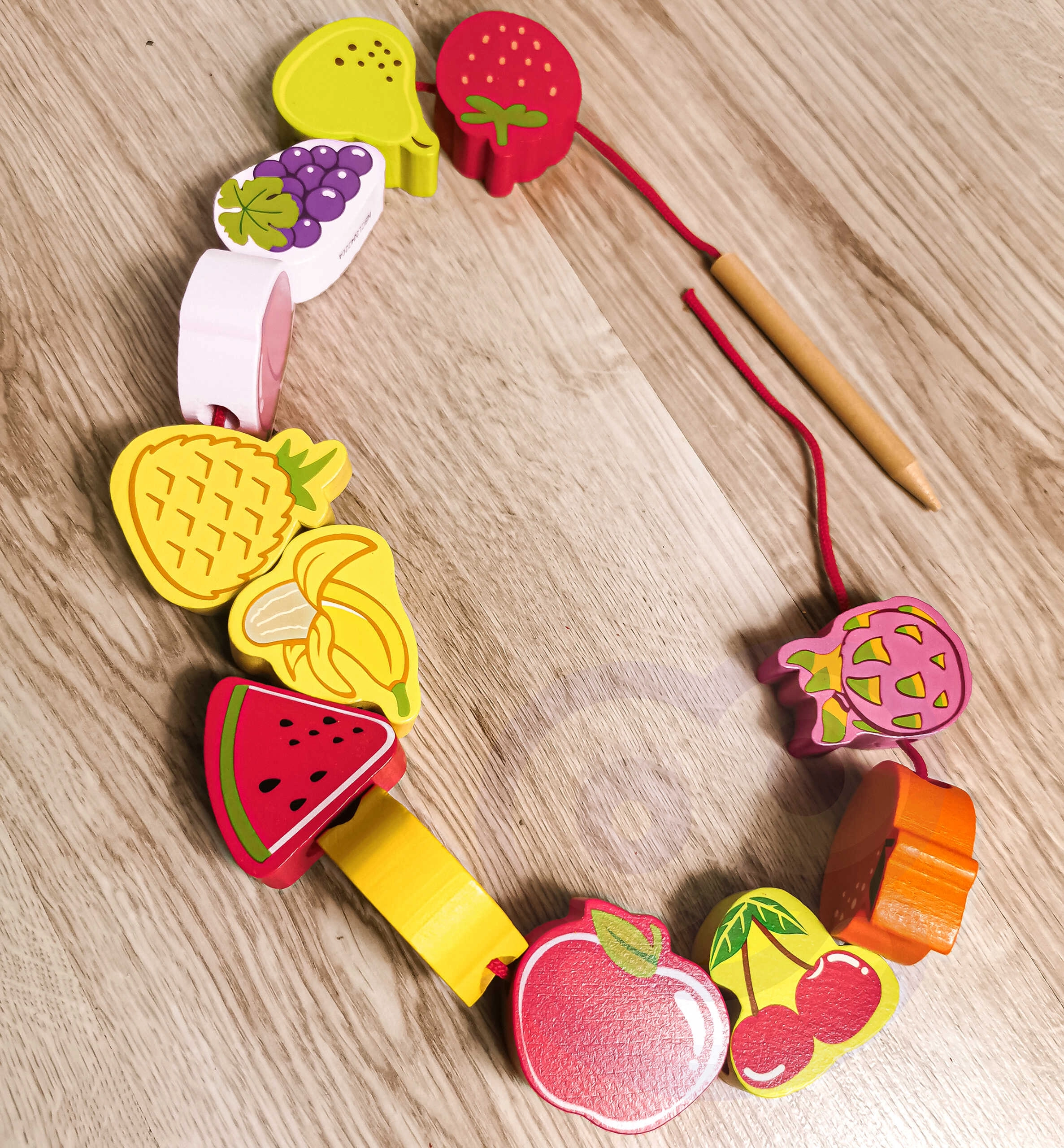 Detalės pagamintos iš kokybiškos lakuotos medienos ir nudažytos saugiais, netoksiškais dažais. Rinkinys patvarus, malonus liesti ir skatina kūrybišką bei atvirą žaidimą – karoliukus galima verti bet kokia seka ir kurti savo „vaisių grandinėles“.
