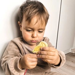 Vaisinių karoliukų vėrimas ant virvelės su medine adata natūraliai treniruoja suėmimą, judesių tikslumą ir akių-rankų koordinaciją.