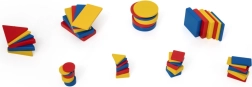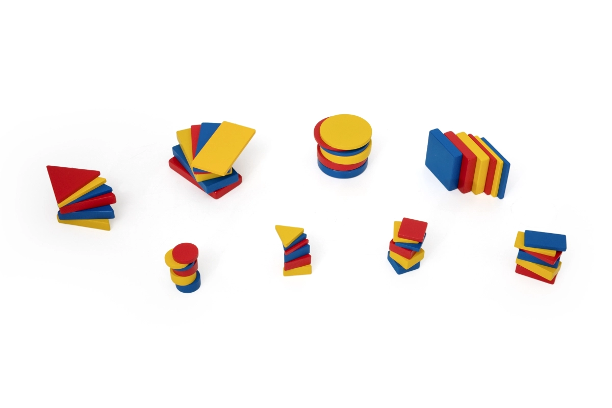 Gausus geometrinių figūrų rinkinys raudonos, geltonos ir mėlynos spalvos skatina vaikus dėlioti raštus, rūšiuoti bei atpažinti formas ir spalvas.
