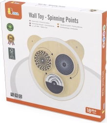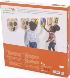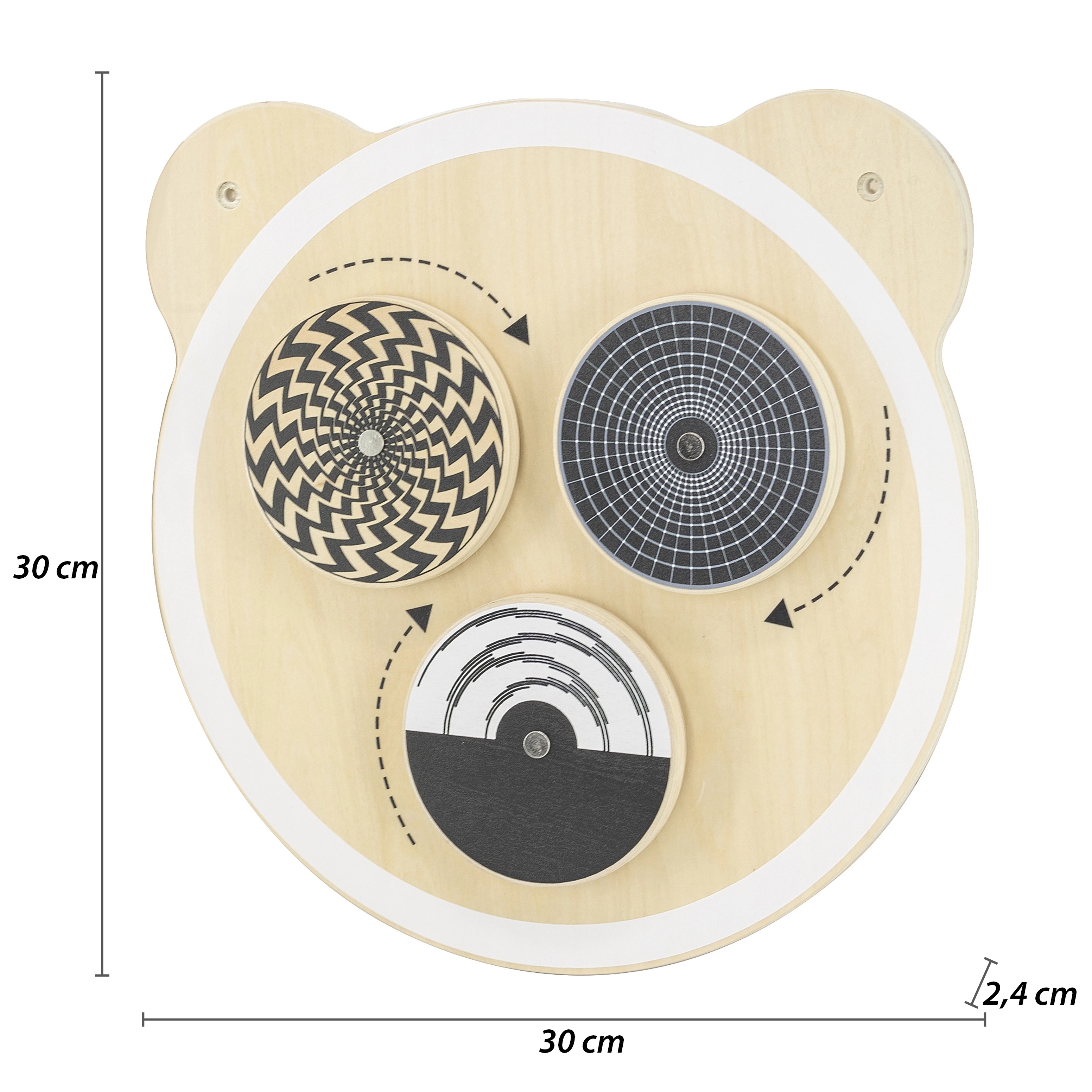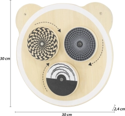 Medinė sieninė lenta su meškos motyvu idealiai tinka vaikų loginiam mąstymui ir vaizduotei ugdyti. Joje yra trys apskriti elementai, kurie sukantis kuria optines iliuzijas, o paviršius nudažytas netoksiškais, ryškių atspalvių dažais. Šis žaislas pradžiugins kiekvieną vaiką ir tinka tiek namams, tiek ugdymo įstaigoms.