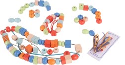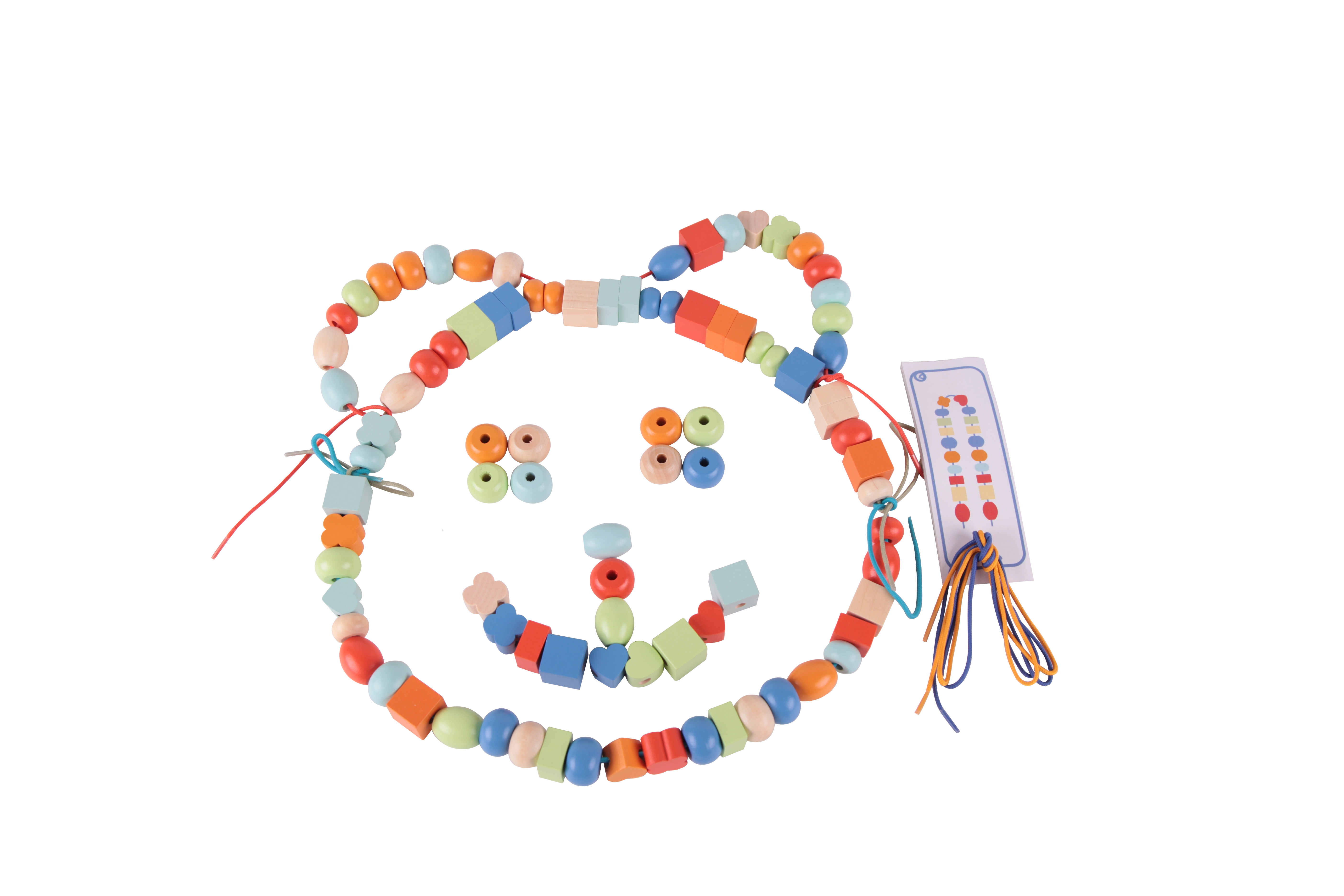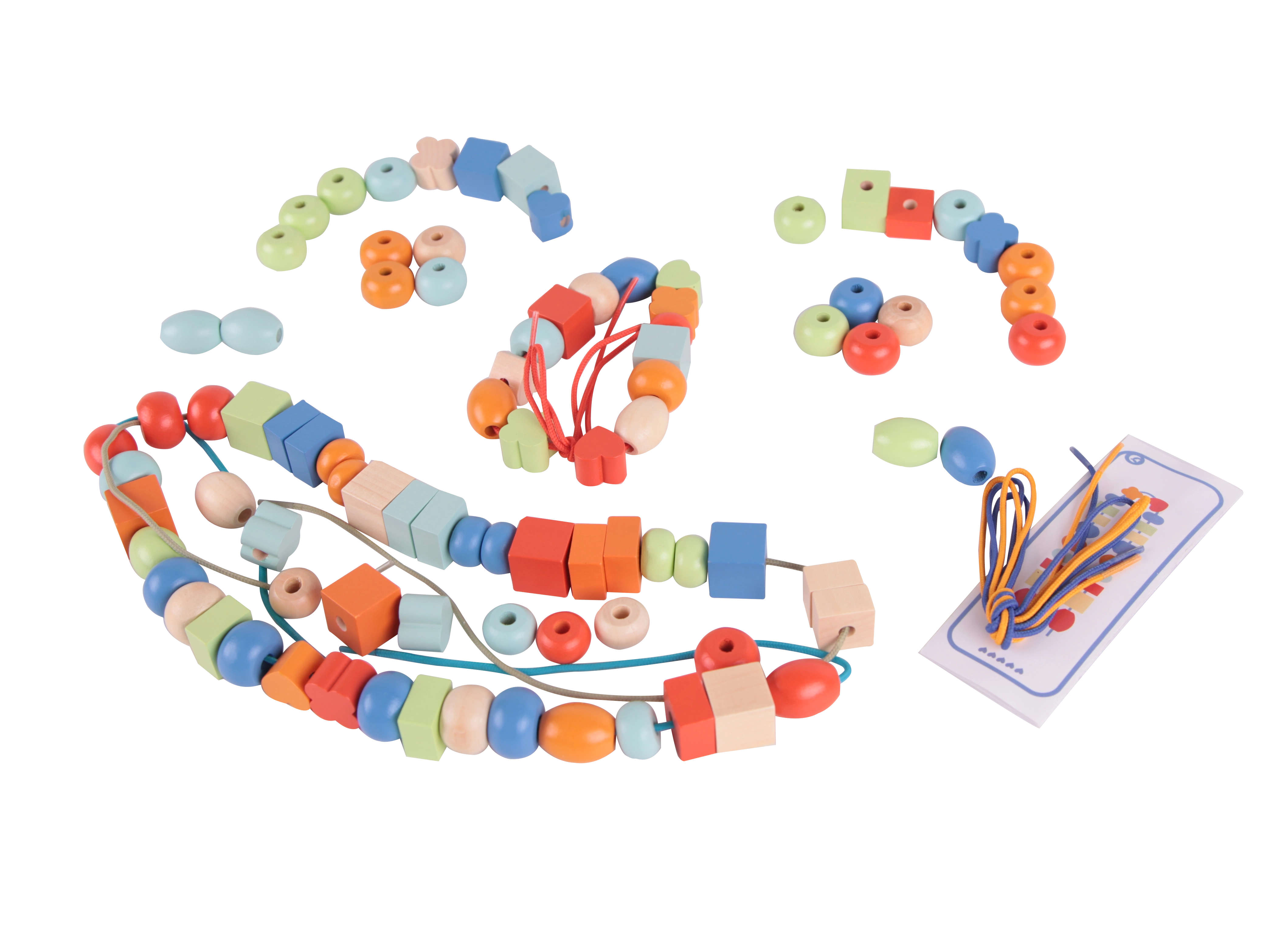 Spalvoti mediniai karoliukai su įvairiomis formomis ir spalvomis skatina vaikų smulkiąją motoriką ir kūrybiškumą.