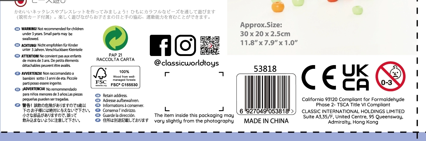 Ekologiški žaislai, sukurti patiems mažiausiems, pagaminti iš natūralių, biologiškai skaidžių ir hipoalerginių medžiagų. Jie saugūs vaikams ir aplinkai. Classic World – pripažintas žaislų prekės ženklas – užtikrina kokybę per griežtą gamybos kontrolę ir tarptautinius standartus. Jūsų vaikai nusipelno tik geriausio.