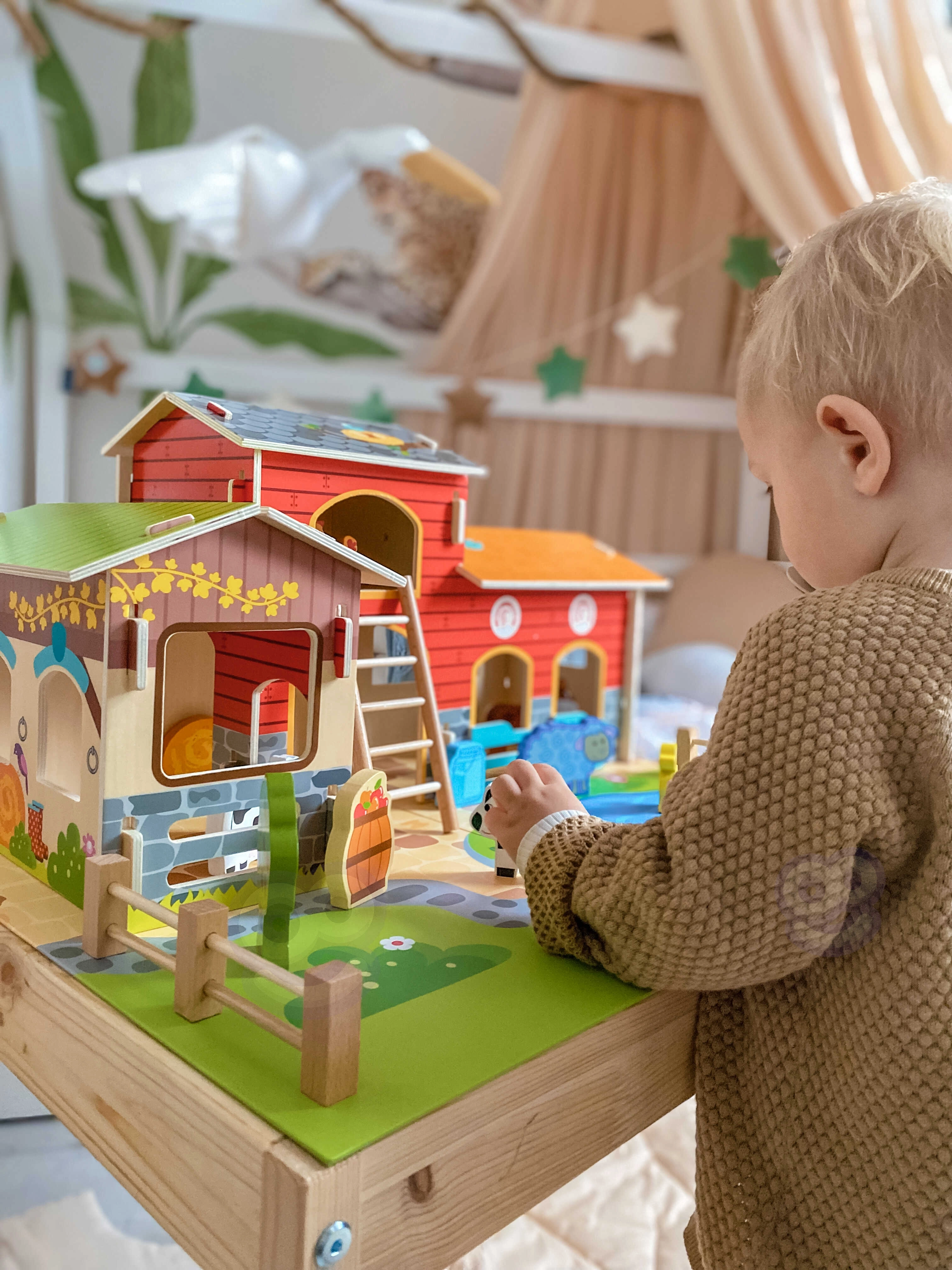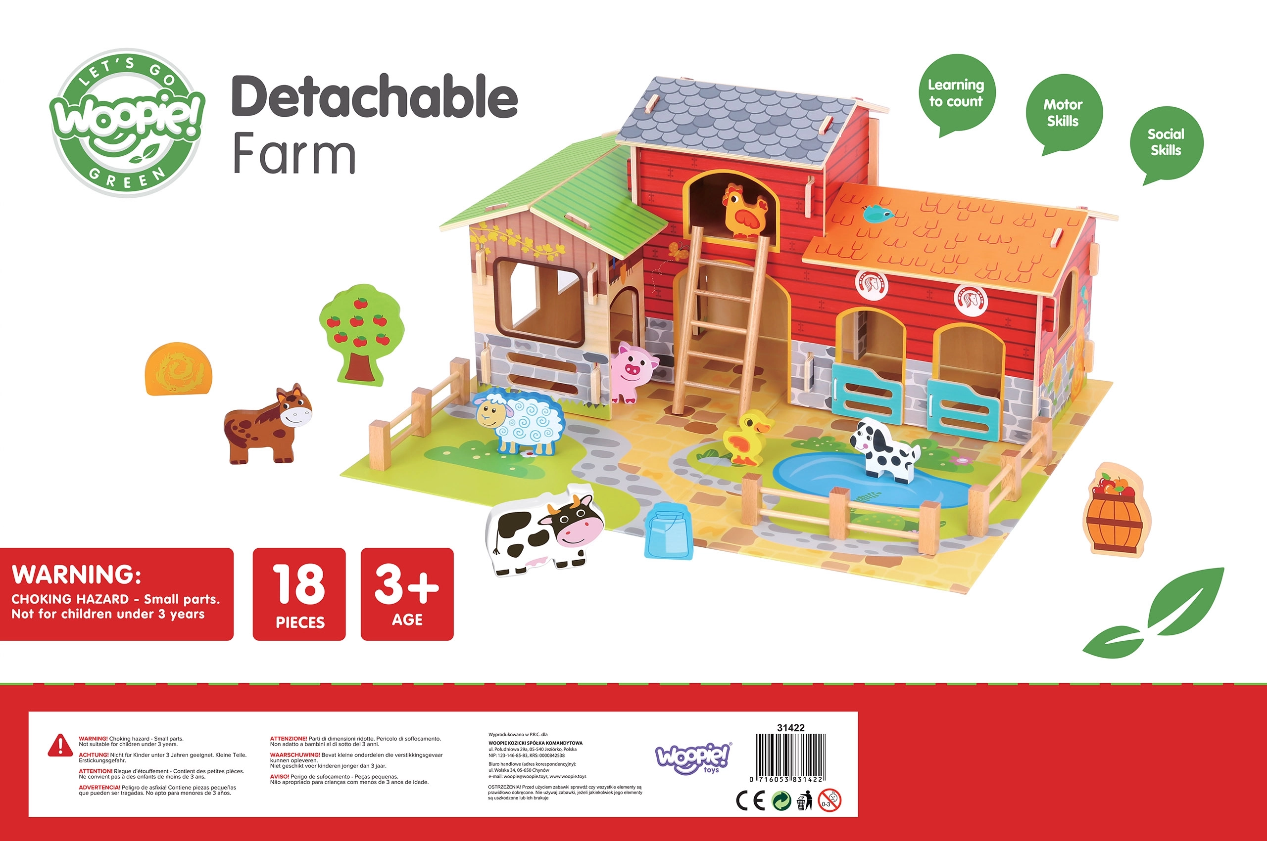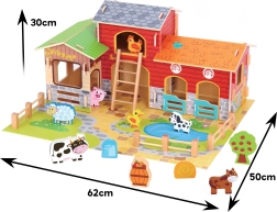 Sukurkite savo ūkį namuose! Medinė mega ferma WOOPIE GREEN nukelia vaikus į gamtos pasaulį, kur jie mokosi rūpintis gyvūnais ir atranda kasdienį kaimo gyvenimą. Realistiški pastatai (tvartas, daržinė ir vištidė), tvenkinys ir detalios figūrėlės skatina kūrybišką istorijų pasakojimą ir vaidmeninius žaidimus.