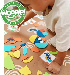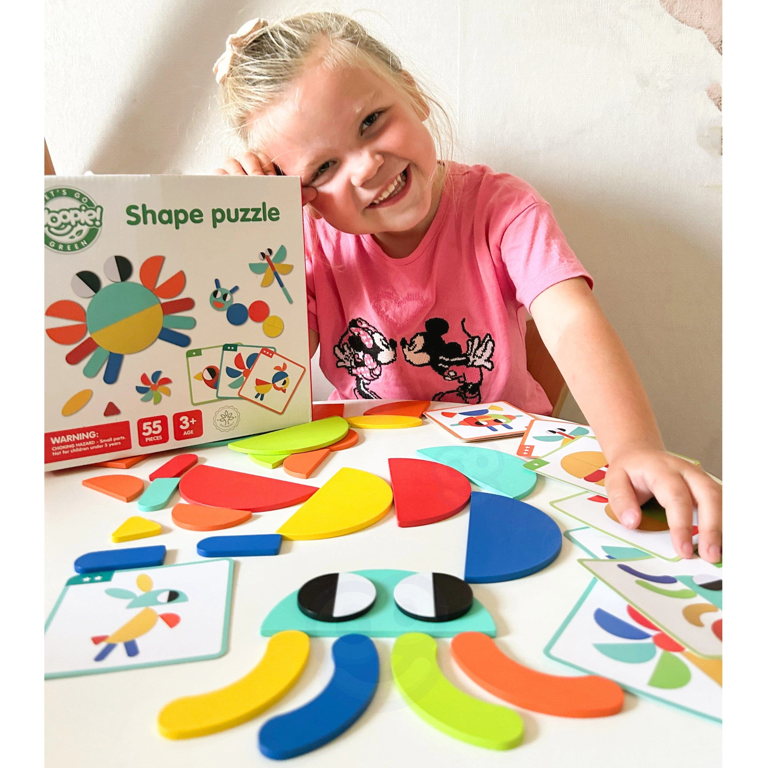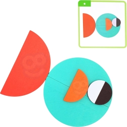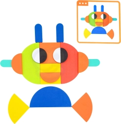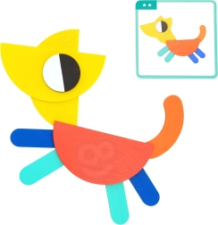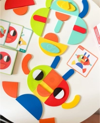 Ši išmani dėlionė sujungia spalvotas medines figūras ir dvišales korteles su šablonais, kurių dėka vaikai lavina formų ir spalvų atpažinimą, erdvinį mąstymą ir judesių tikslumą. Galima dėlioti pagal korteles arba kurti savo piešinius – fantazijai ribų nėra.