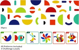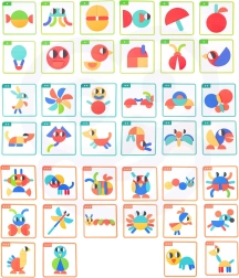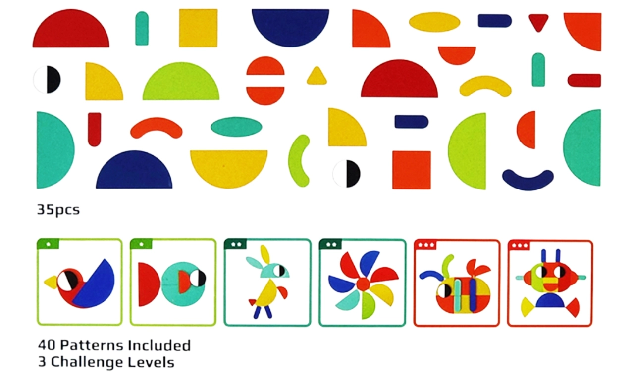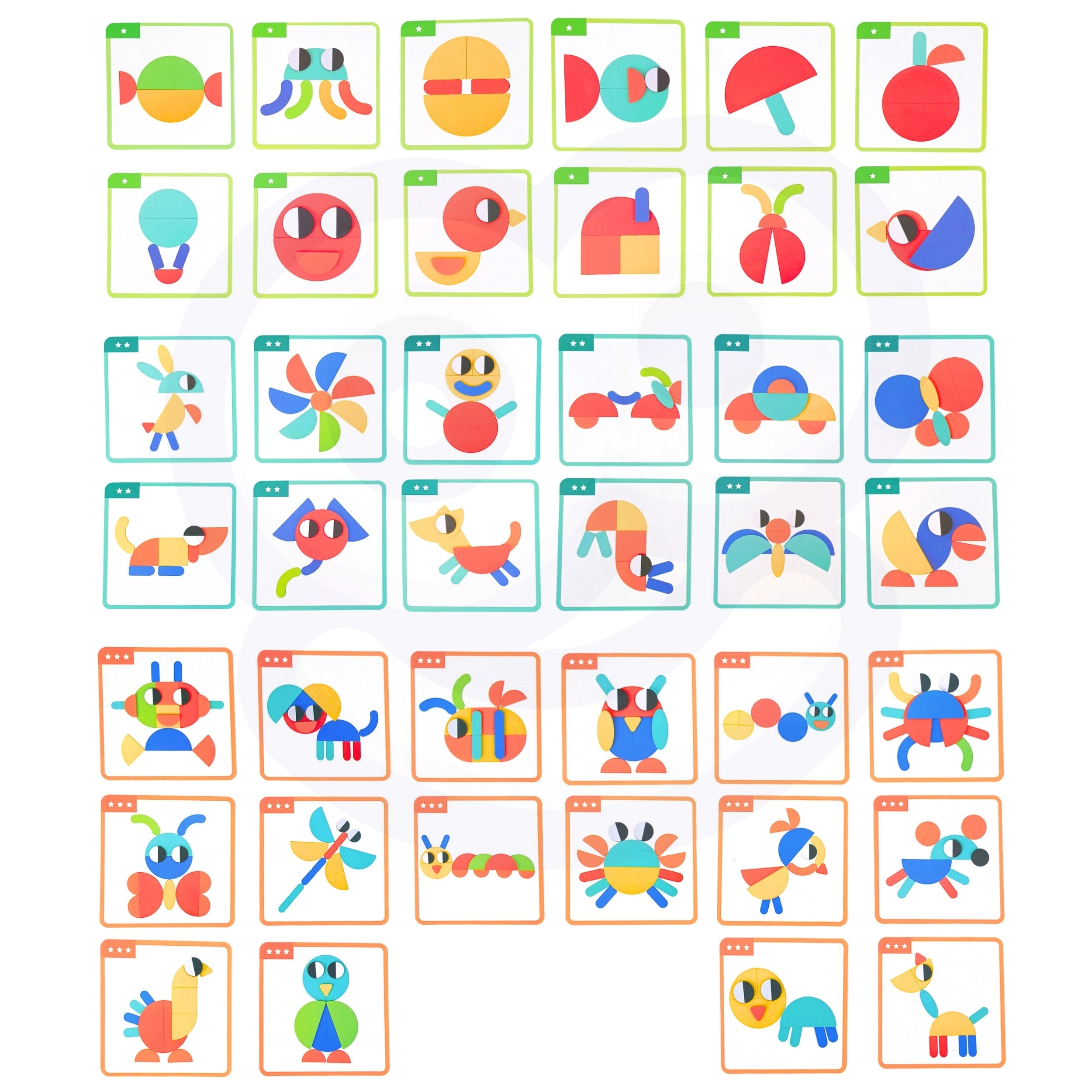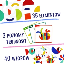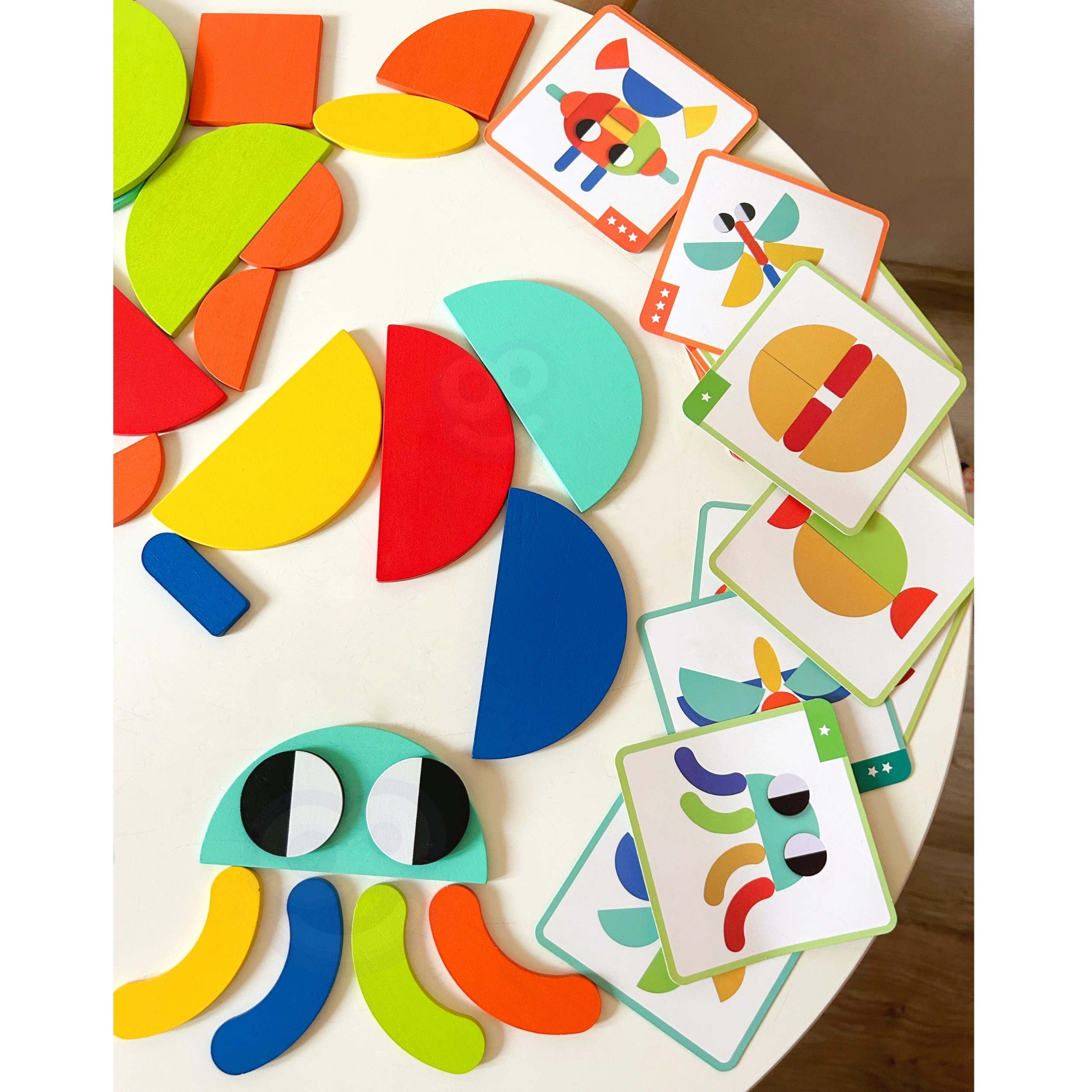 Vaikai dėlioja spalvotas figūras pagal dvišales korteles arba kuria savo piešinius. Jie lavina formų ir spalvų suvokimą, susikaupimą ir judesių tikslumą – smagus mokymasis, kuris įtraukia.
