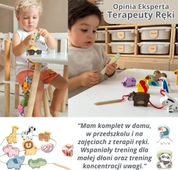 Virvelės vėrimas pro kaladėlių angas treniruoja pirštų tikslumą, suėmimą ir akių–rankų koordinaciją – idealiai tinka vaikams nuo 2 metų.