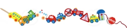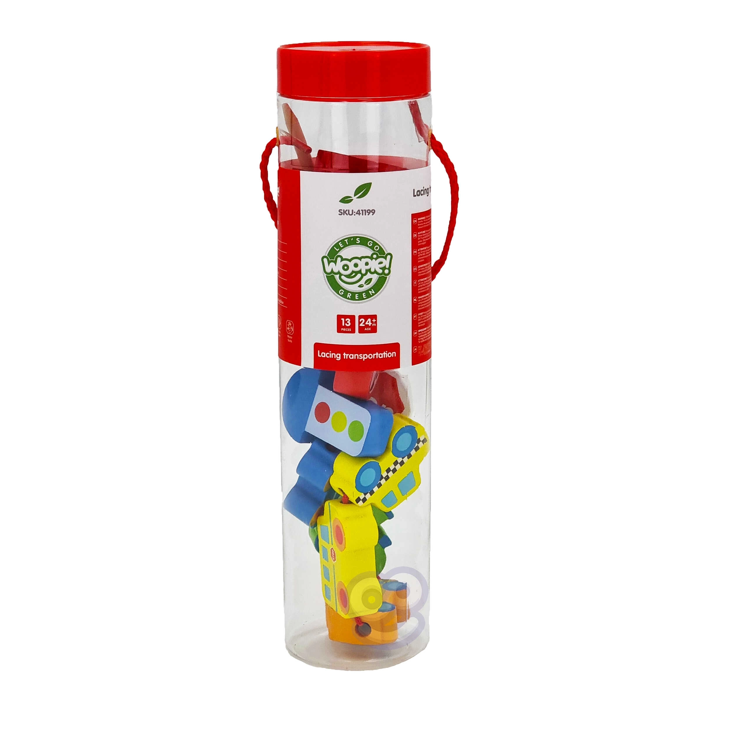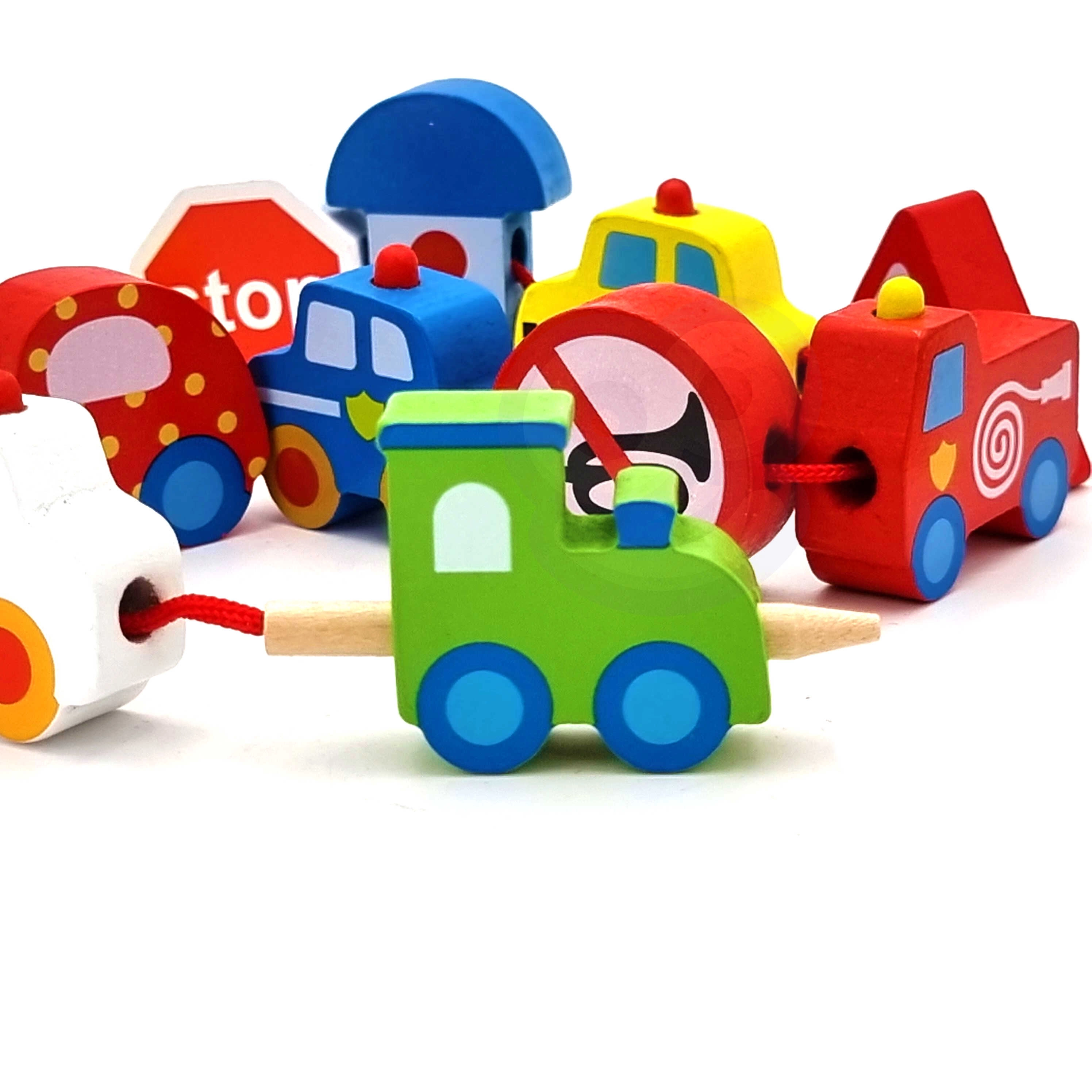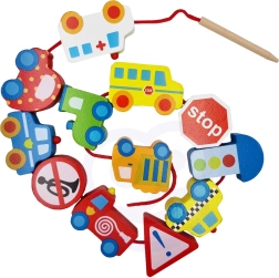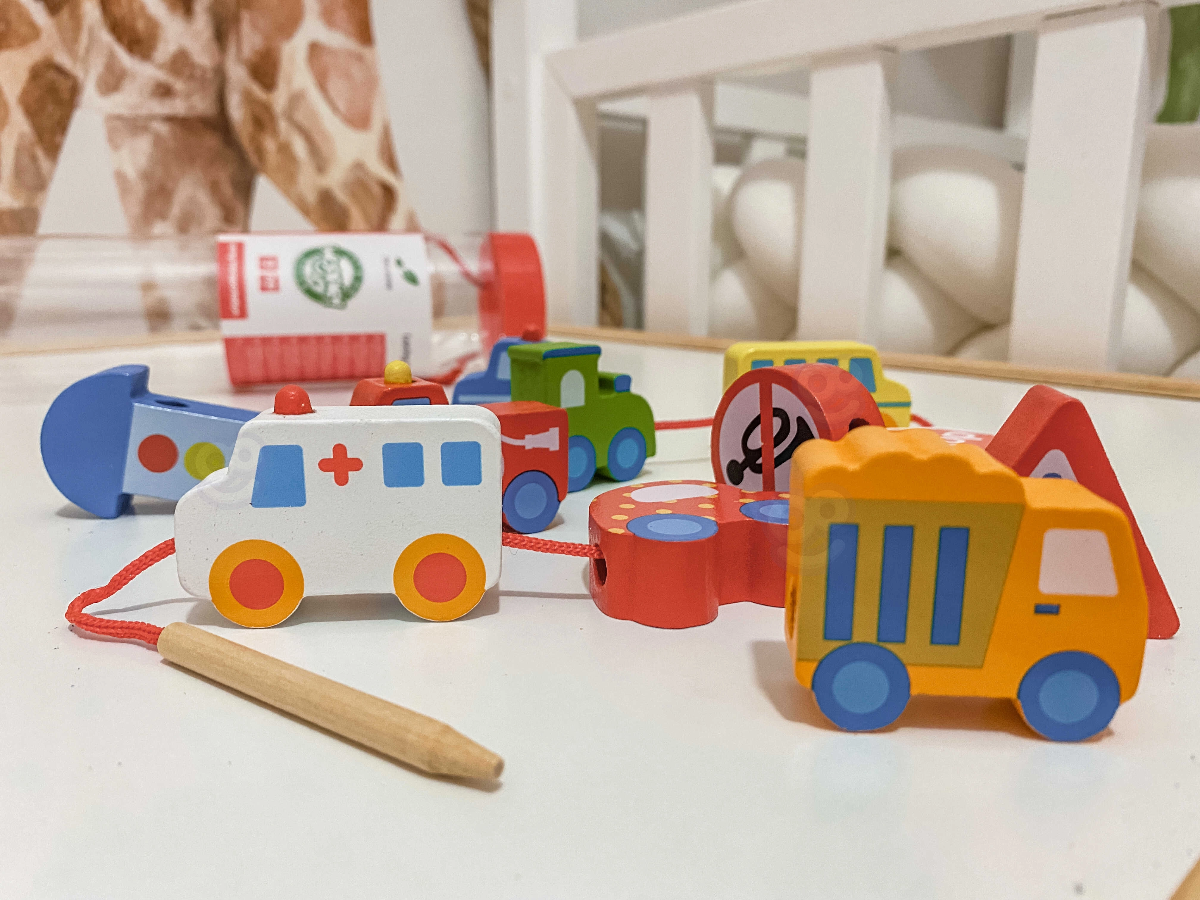 Rinkinyje yra 12 medinių kaladėlių su transporto priemonių motyvais ir 1 virvelė su medine lazdele lengvam vėrimui. Veriant detales galima kurti savo „kolonas“ ar miesto istorijas – nuo gaisrinės automobilio iki policijos automobilio, autobuso ir kelio ženklų.
