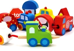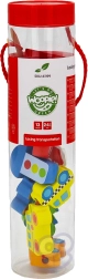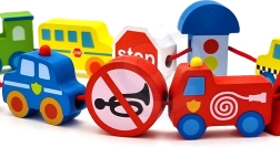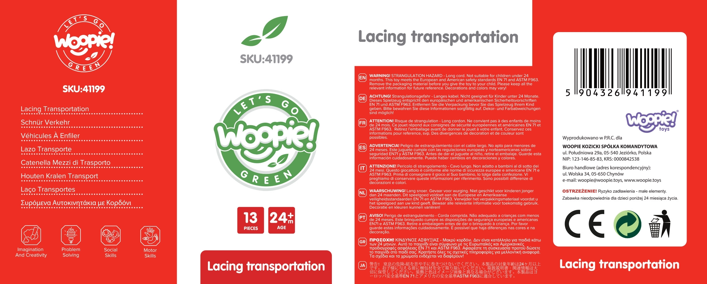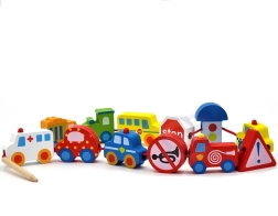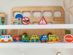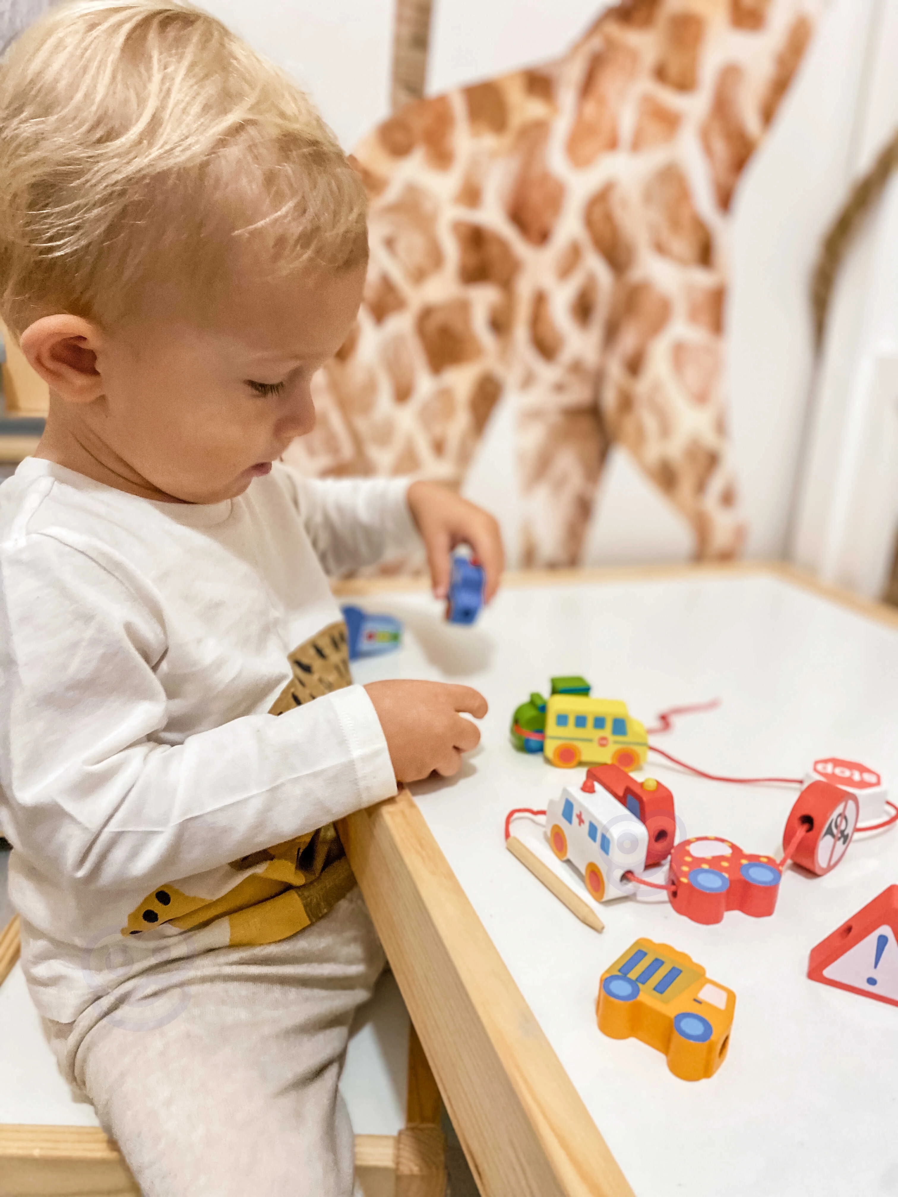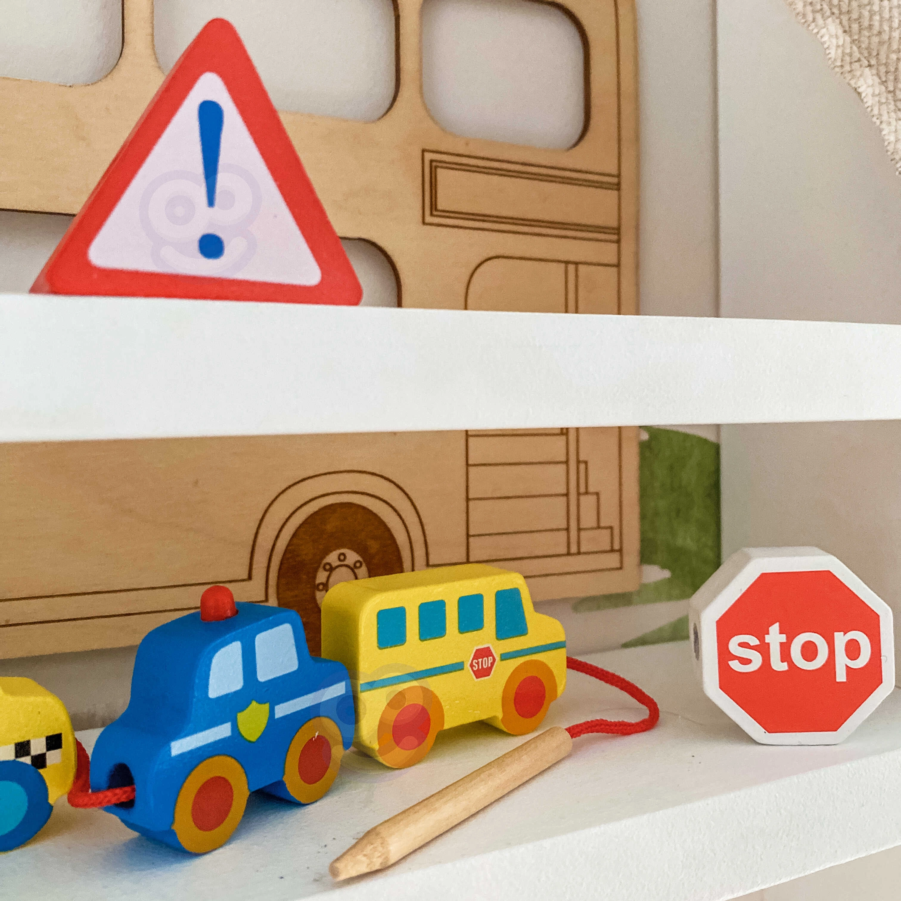 Rinkinyje yra 12 medinių kaladėlių su transporto priemonių motyvais ir 1 virvelė su medine lazdele lengvam vėrimui. Veriant detales galima kurti savo „kolonas“ ar miesto istorijas – nuo gaisrinės automobilio iki policijos automobilio, autobuso ir kelio ženklų.