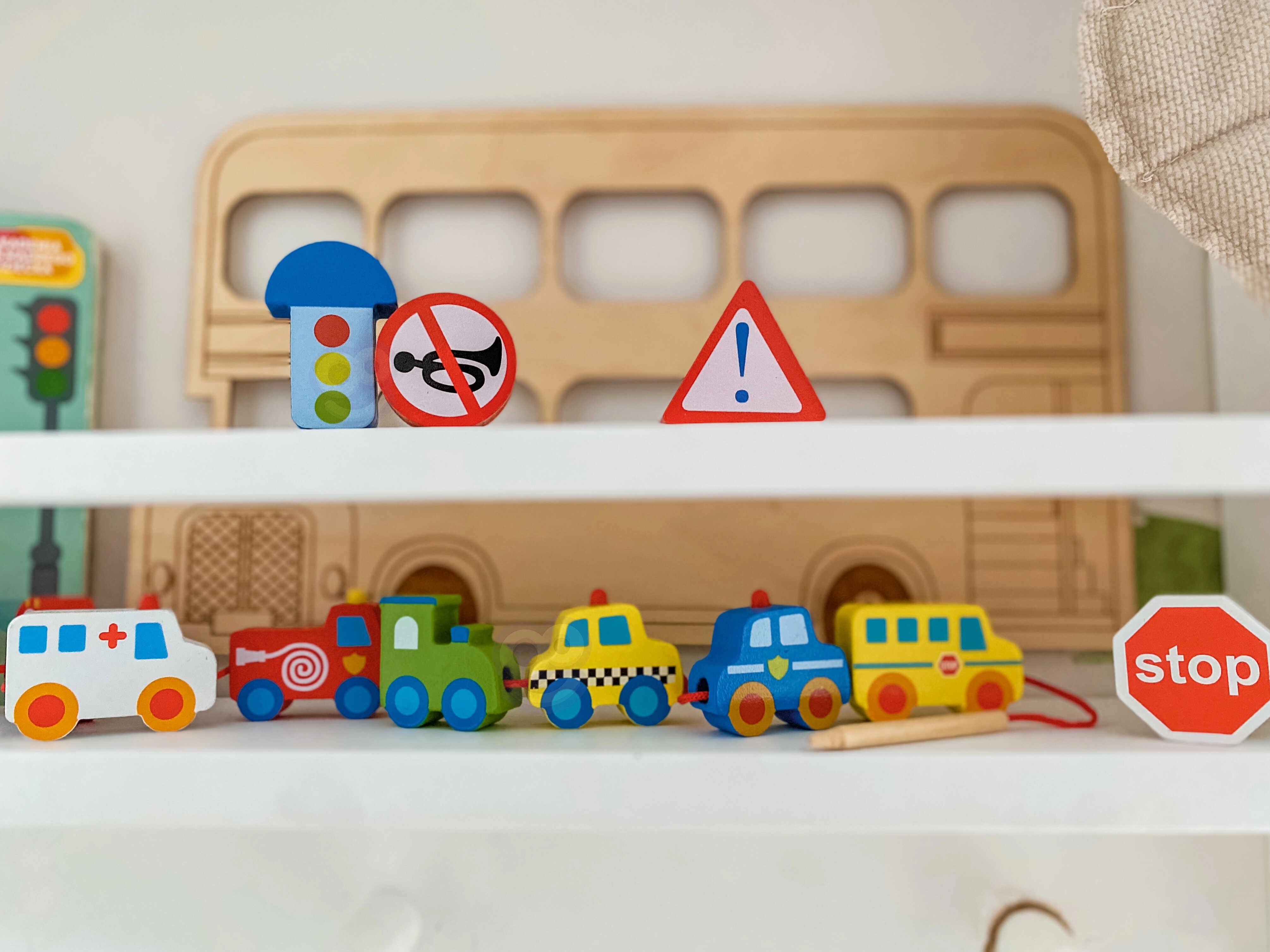 Spalvingi mediniai elementai vaizduoja automobilius, autobusą, traktorių, greitąją pagalbą ir kelio ženklus – vaikai žaismingai susipažįsta su transporto pasauliu.