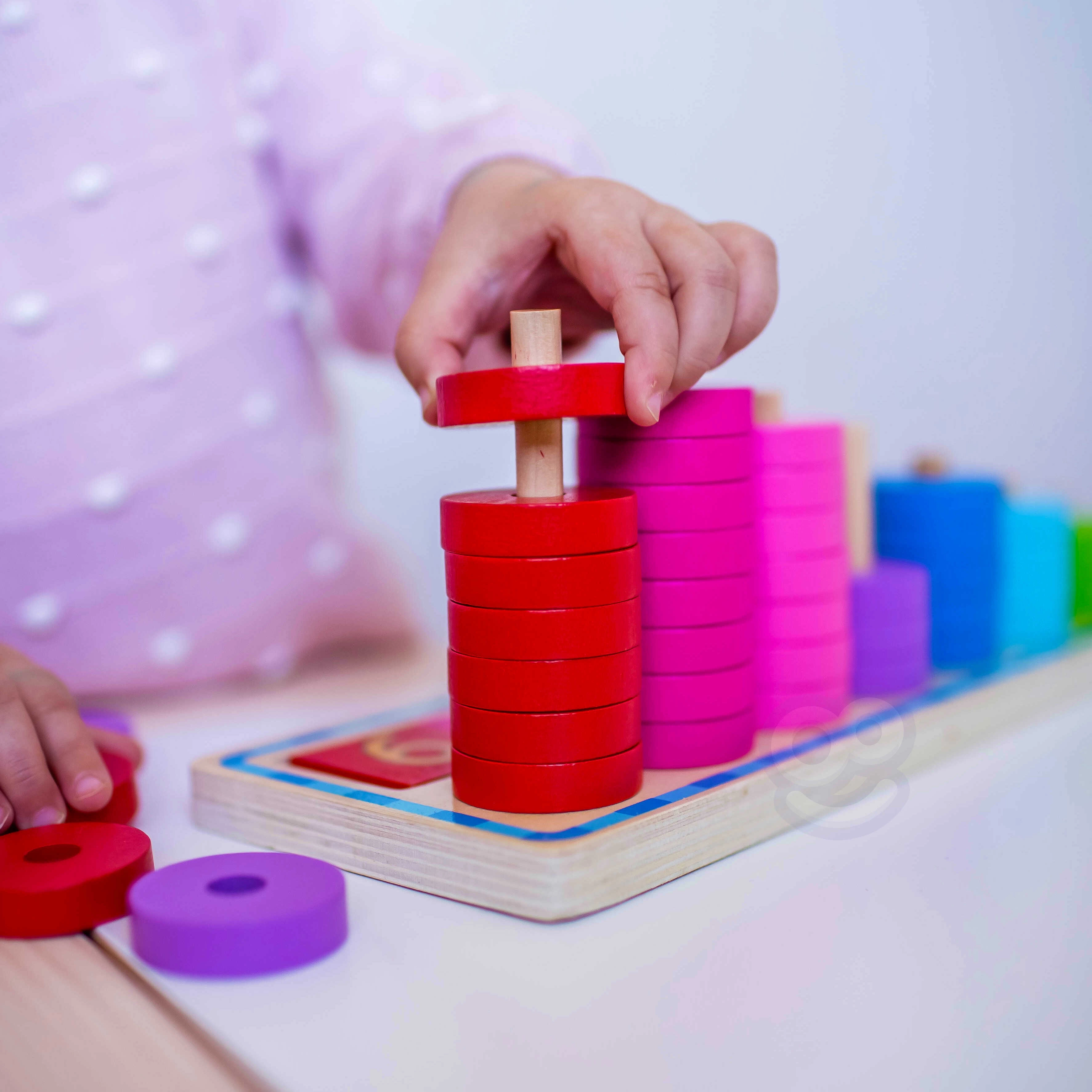 Vaikai priskiria spalvotus žiedelius skaičiams ir intuityviai mokosi skaičiuoti, atpažinti spalvas bei suprasti „daugiau–mažiau“ sąvokas.