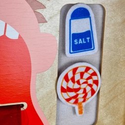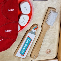 Ši interaktyvi mokomoji priemonė lavina smulkiąją motoriką, loginį mąstymą ir sveikatos raštingumą. Didelis judantis liežuvis su pažymėtomis skonio zonomis ir rinkiniu maisto produktų su lipniomis juostelėmis paverčia mokymąsi linksmu žaidimu. Pridedami ir realistiški priedai – dantų šepetėlis, pasta ir dantų siūlas.