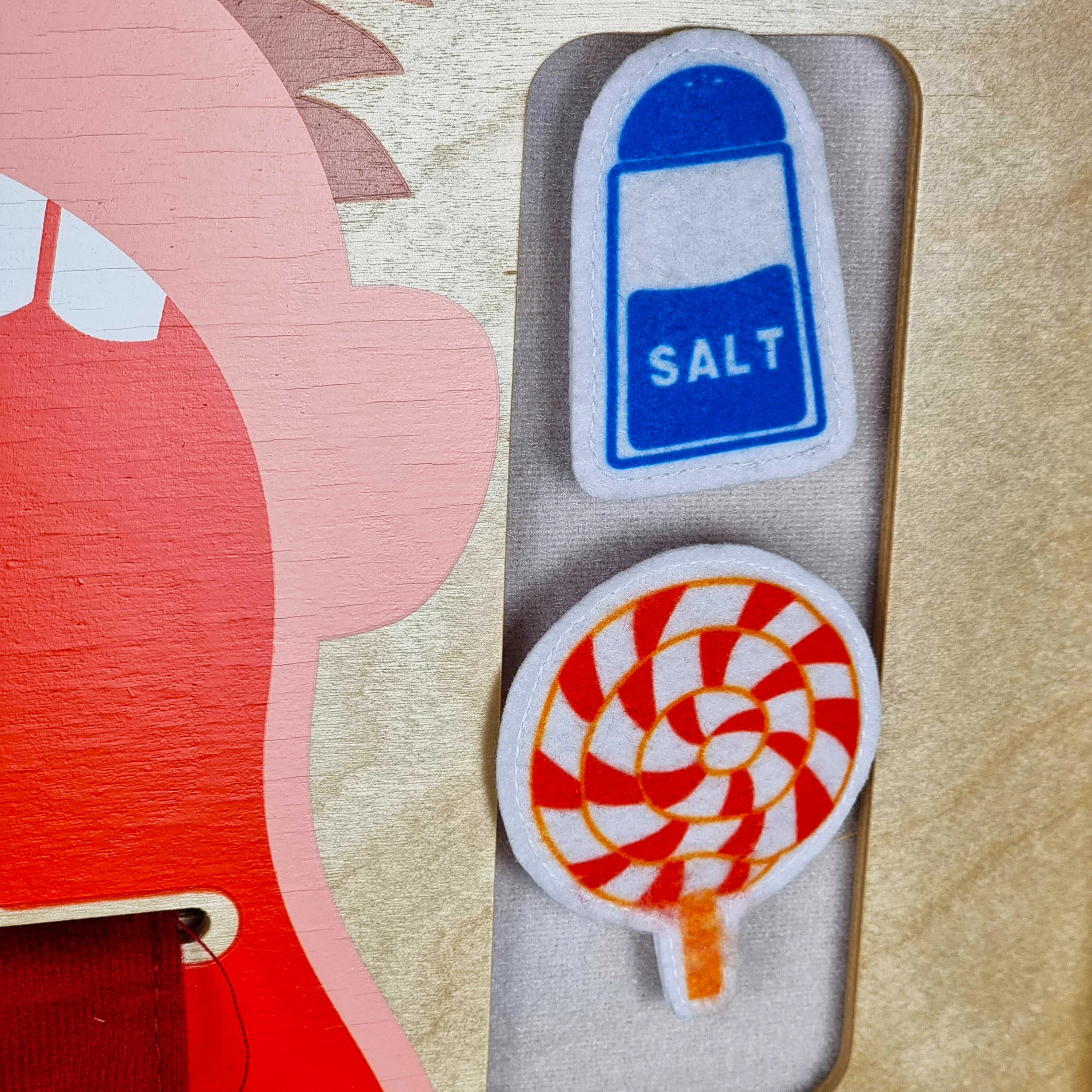 Didelis judantis liežuvis su aiškiai pažymėtomis skonio zonomis ir maisto produktai su lipniomis juostelėmis padeda vaikams atskirti saldų, sūrų, rūgštų ir kartų skonį.