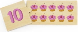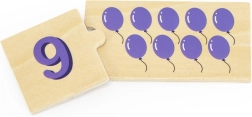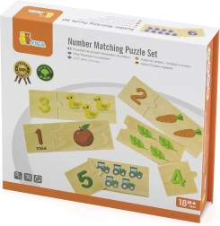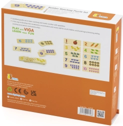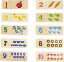Šis nuostabus VIGA medinis dėlionių rinkinys skirtas skaičiavimo lavinimui ir skaičių atpažinimui. Vaikas lengvai mokosi skaičiuoti, atpažinti skaičius ir priskirti kiekvienam skaičiui tinkamą objektų kiekį. Dėl patrauklių spalvų ir paveikslėlių, tokių kaip gyvūnai, vaisiai ar transporto priemonės, vaikai pažįsta juos supantį pasaulį. Taip pat lavina koncentraciją, žodyną ir loginį mąstymą.