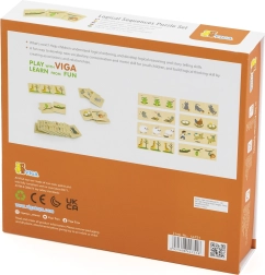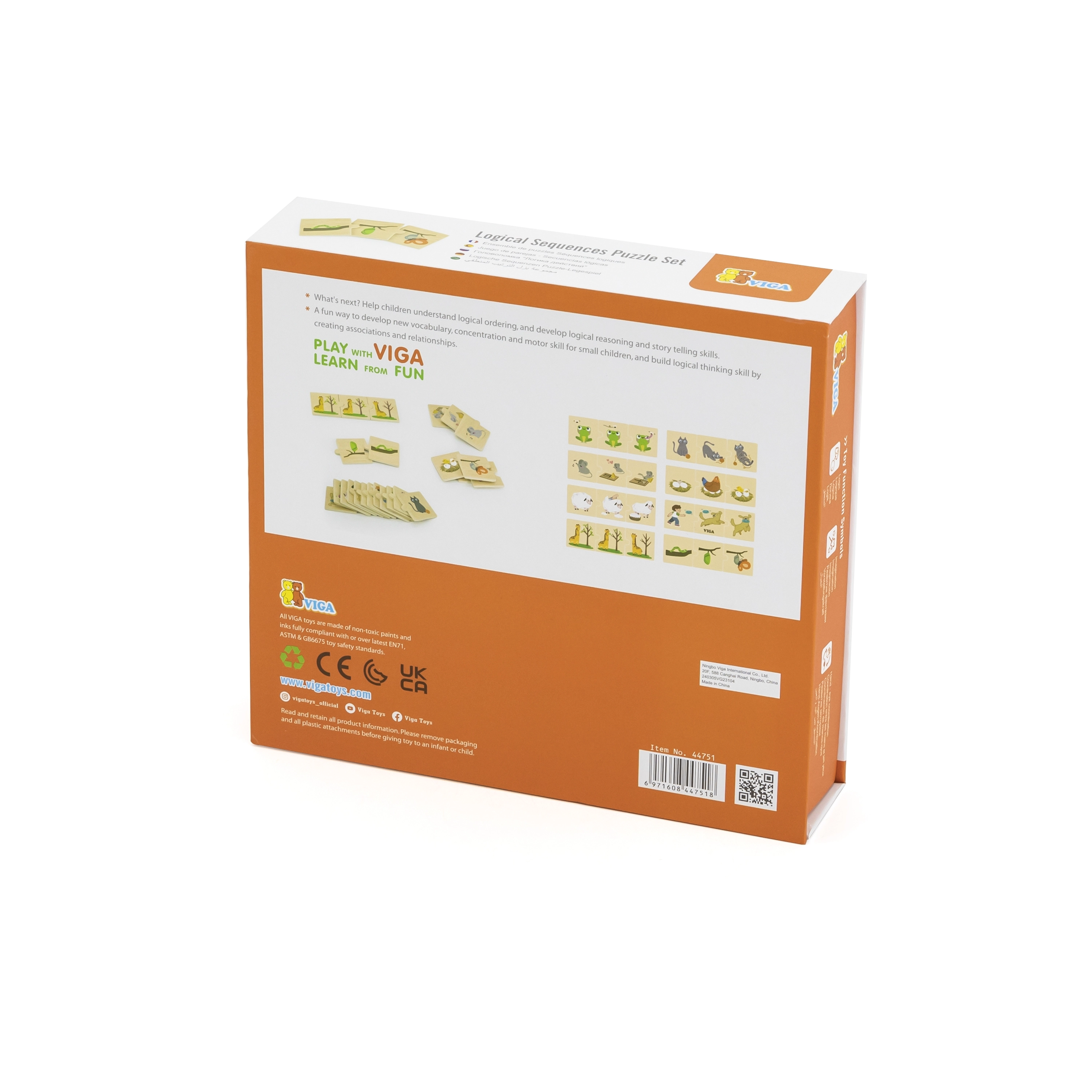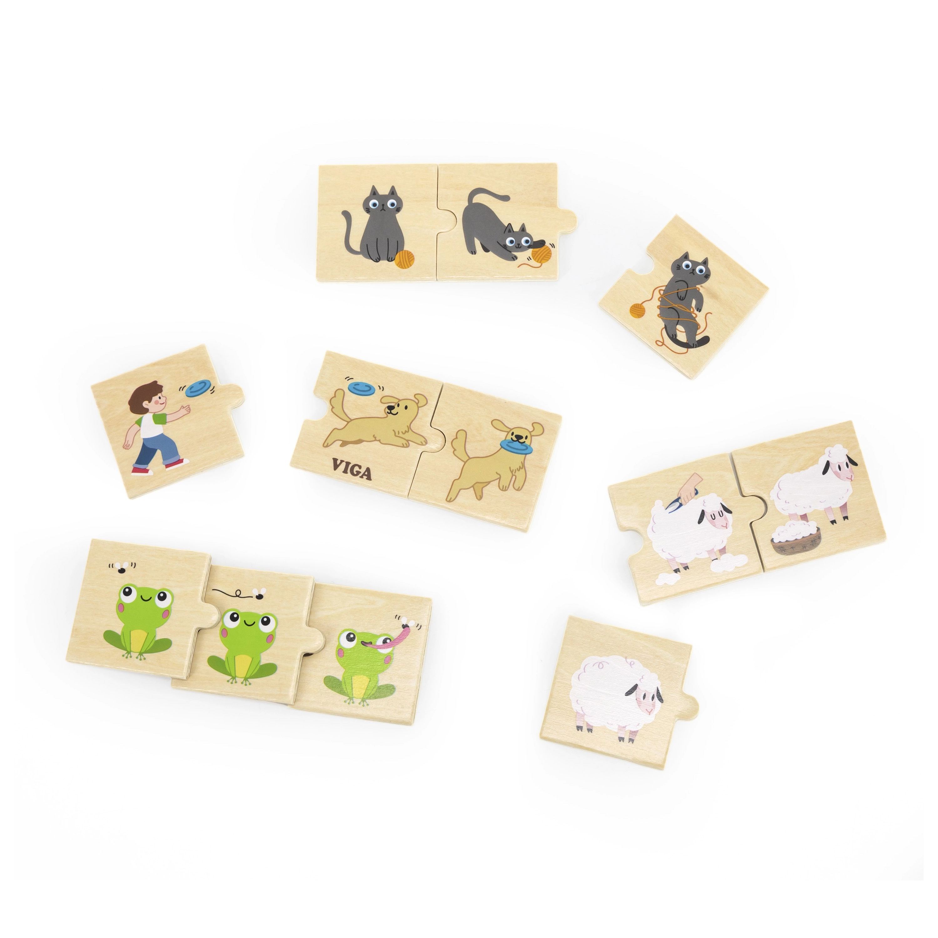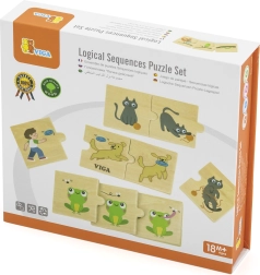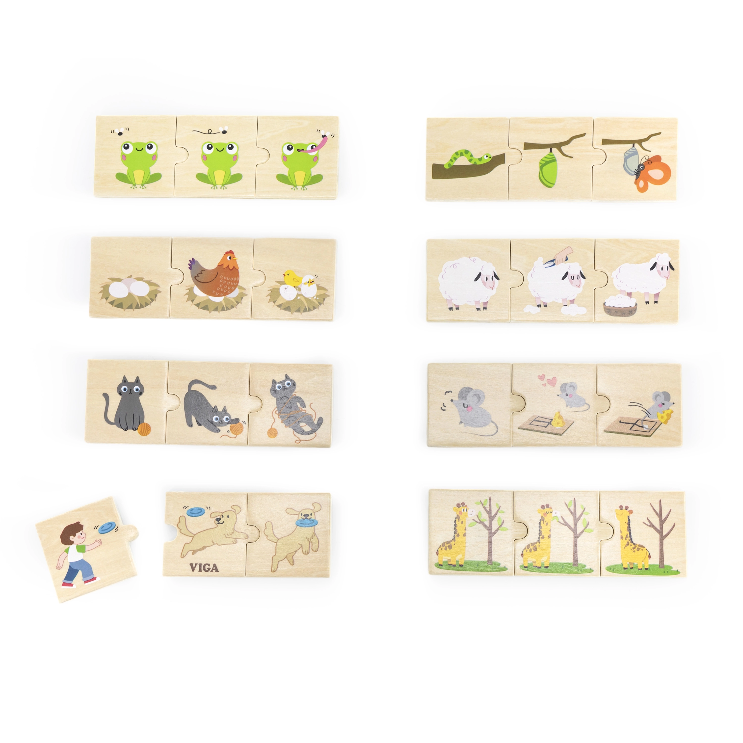 Smagus ir lavinamasis medinių dėlionių rinkinys iš prekės ženklo VIGA moko vaikus sudėti gyvūnų veiklas į teisingą seką. Sudėtyje yra 24 mediniai detalių, sudarantys 8 logines sekas (pvz., šuns atnešimas arba žirafa, kuri skabo lapus nuo medžio). Skatina loginį mąstymą, žodyną, koncentraciją, smulkiąją motoriką ir akių–rankų koordinaciją, tinka jau nuo 18 mėnesių.