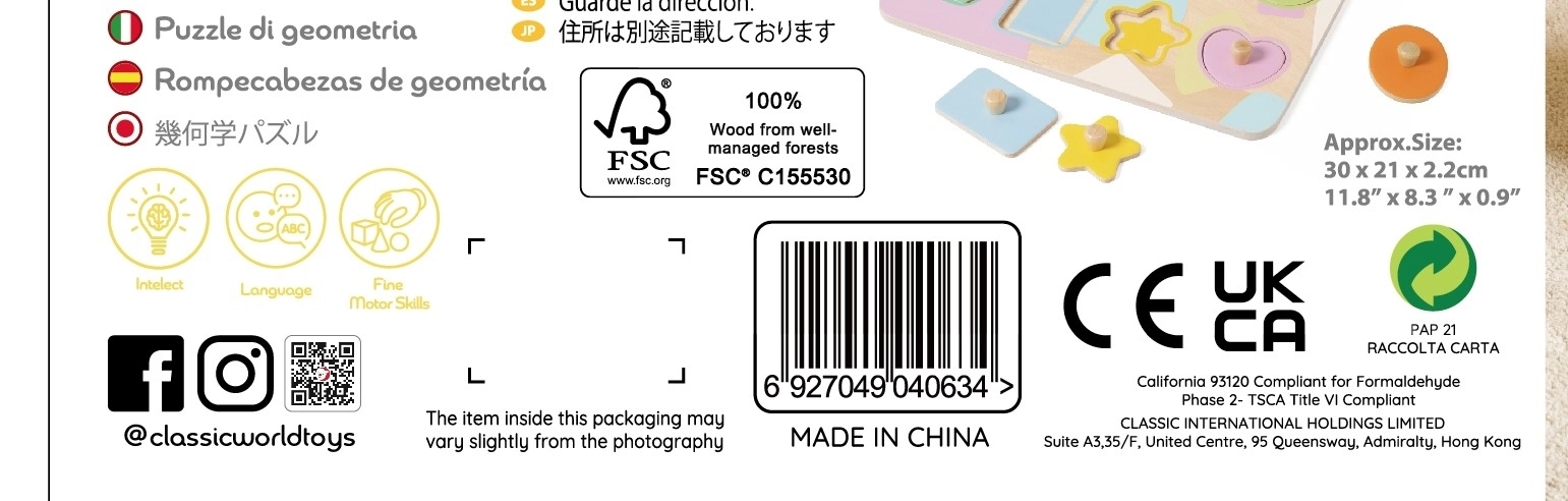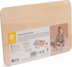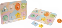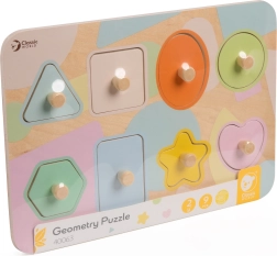 Ši graži medinė dėlionė siūlo daug mokymosi ir pramogų galimybių. Rinkinyje yra devynios dalys su skirtingomis geometrinėmis formomis, nudažytos maloniomis pastelinėmis spalvomis. Vaikai mokosi atpažinti formas ir spalvas dėliodami detales į atitinkamas angas lentoje.
