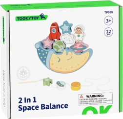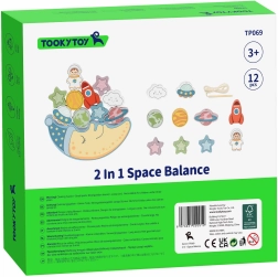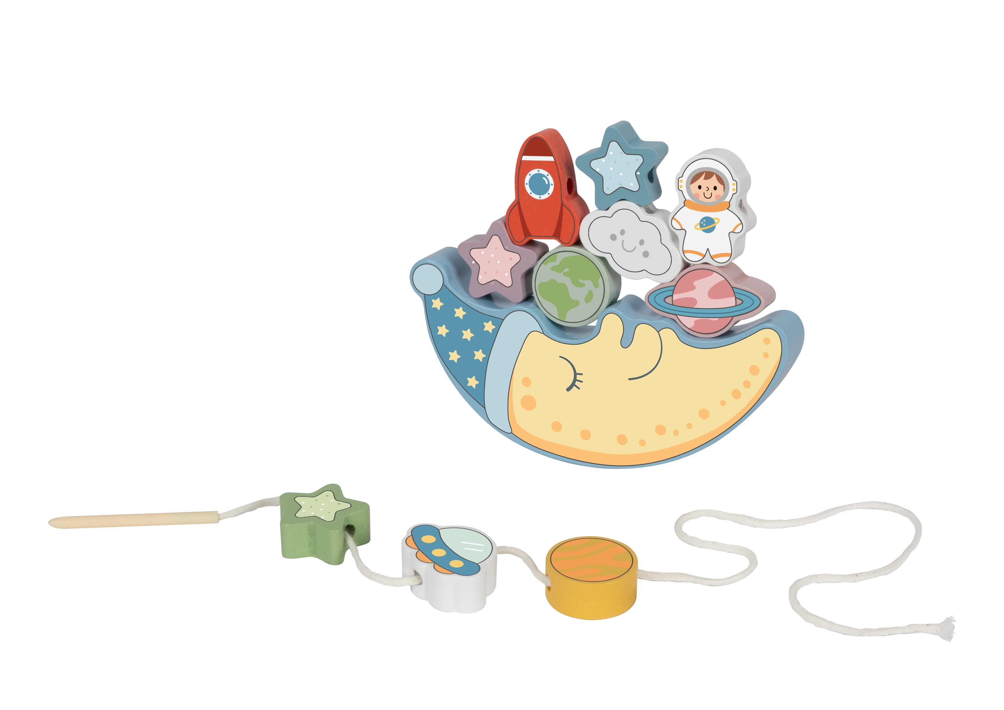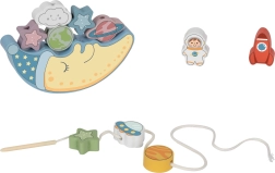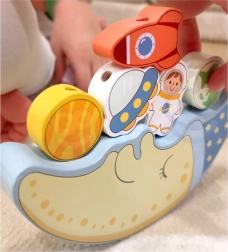 Pirmoji rinkinio dalis – balansuojantis iššūkis: vaikai bando uždėti 10 spalvotų blokelių – raketą, astronautą, žvaigždes, NSO, planetas ir linksmą debesį – ant mieguisto mėnulio veido, stengdamiesi, kad konstrukcija nenugriūtų. Tai puiki proga lavinti tikslumą ir kantrybę.